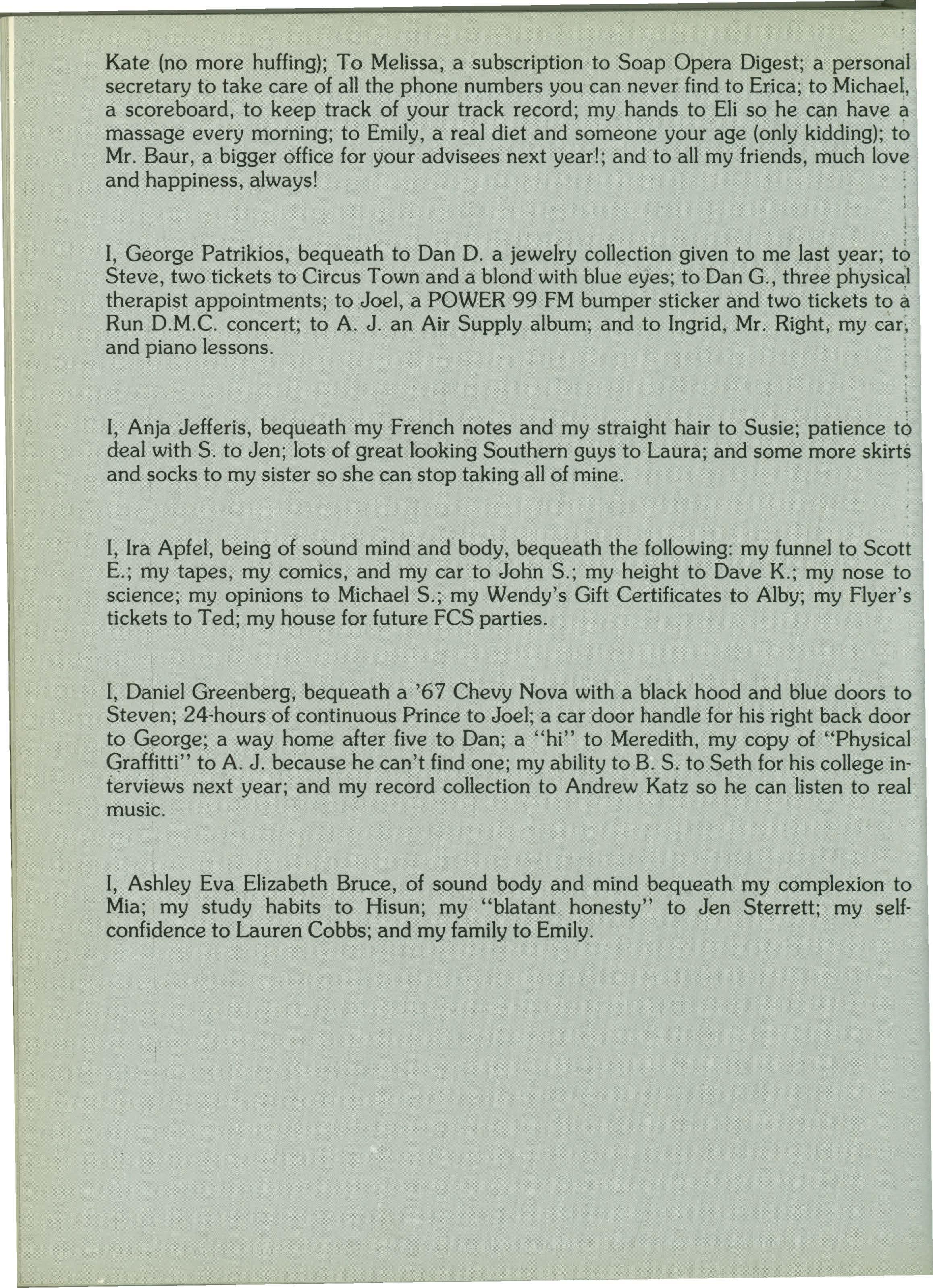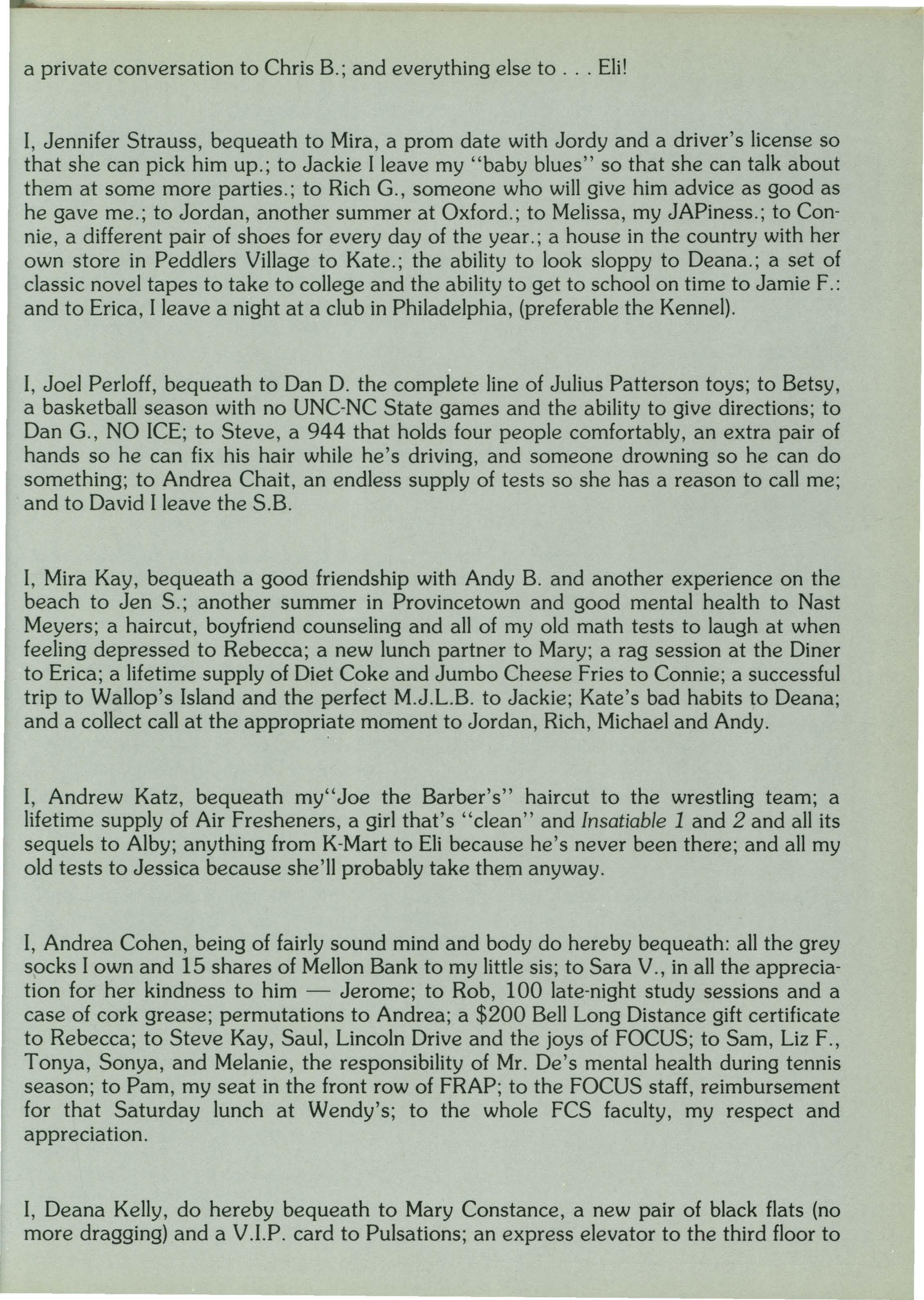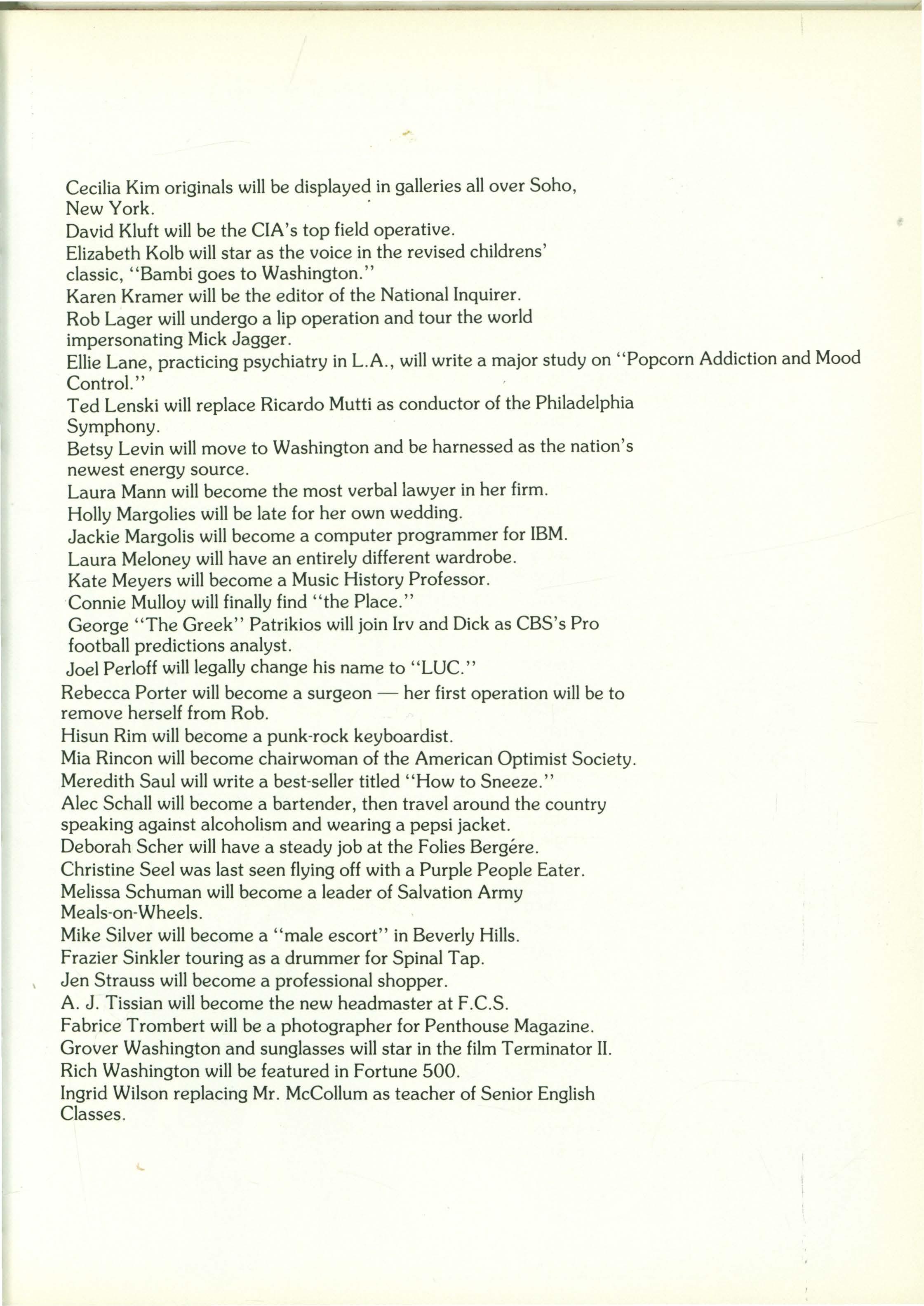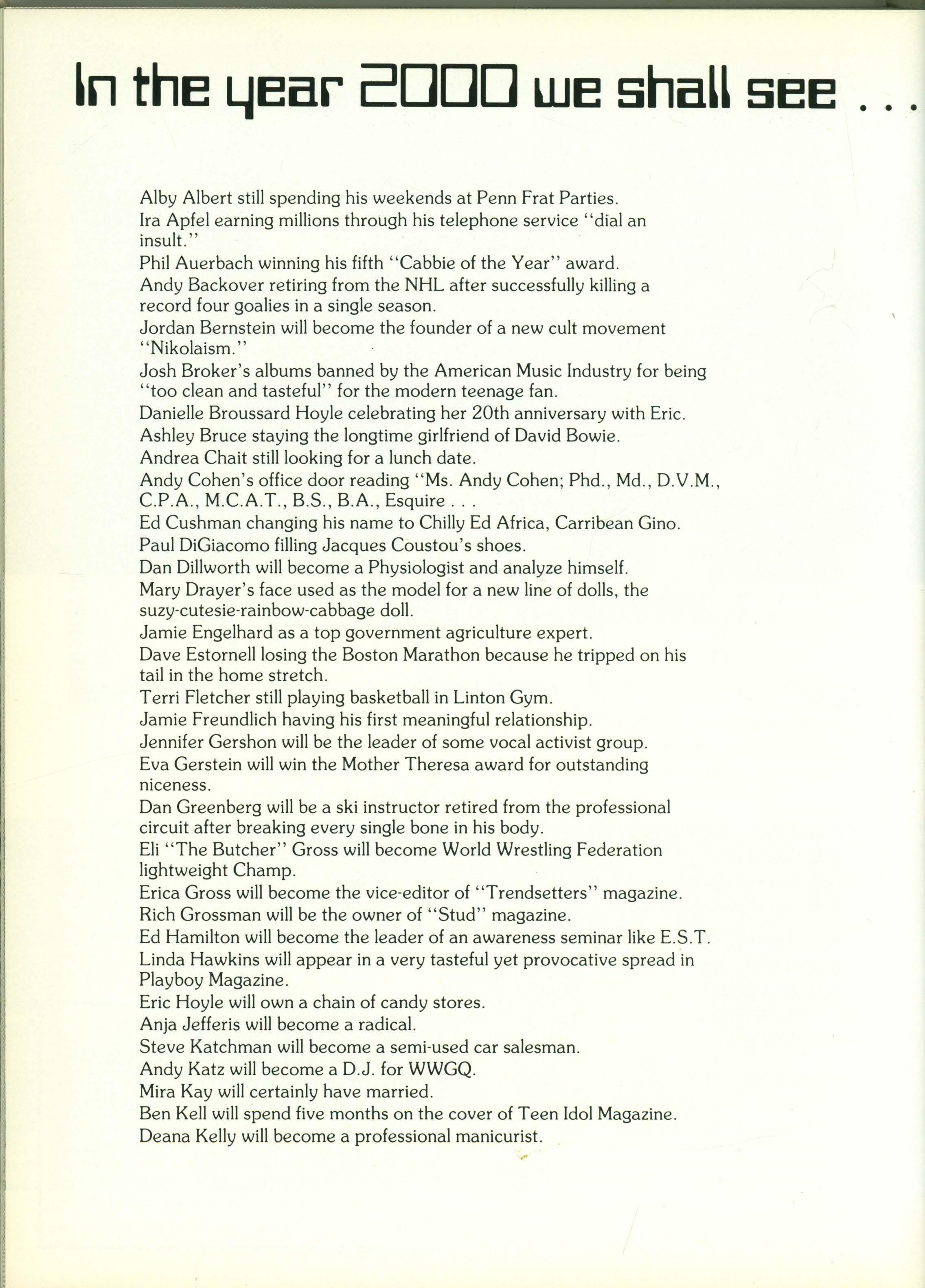 Editors: Andrea Cohen, Karen Kramer. Faculty Advisor: Mr. John McCollum. Assistant Editors: Dave Kluft, Andy Katz, Eric Hoyle, Rebecca Porter, Andrea Chait, Steve Kay, Joel Perloff. Members: Michelle Blum, Melanie Fisher, Jimmy Rutenberg, Ellen Cohen, Maria Farnon, Dan Bernstein, Eric Kramer, Liz Gerst, Matthew Bernstein, Ari Goldfine, Chris Bonovitz, Sara Volkman, Pam Rief, Michael Silver, Andrew Katz, Joel Perloff, Phil Auerbach, Ira Apfel, Dan Dilworth, Sam Hauser, Elizabeth Chait, Liz Freedman, Jordan Bernstein, Laura Mann, Mike Porter, Leah Coplon, Pete Klein, Dan Greenberg, Eric Hoyle, Liz Robbins.