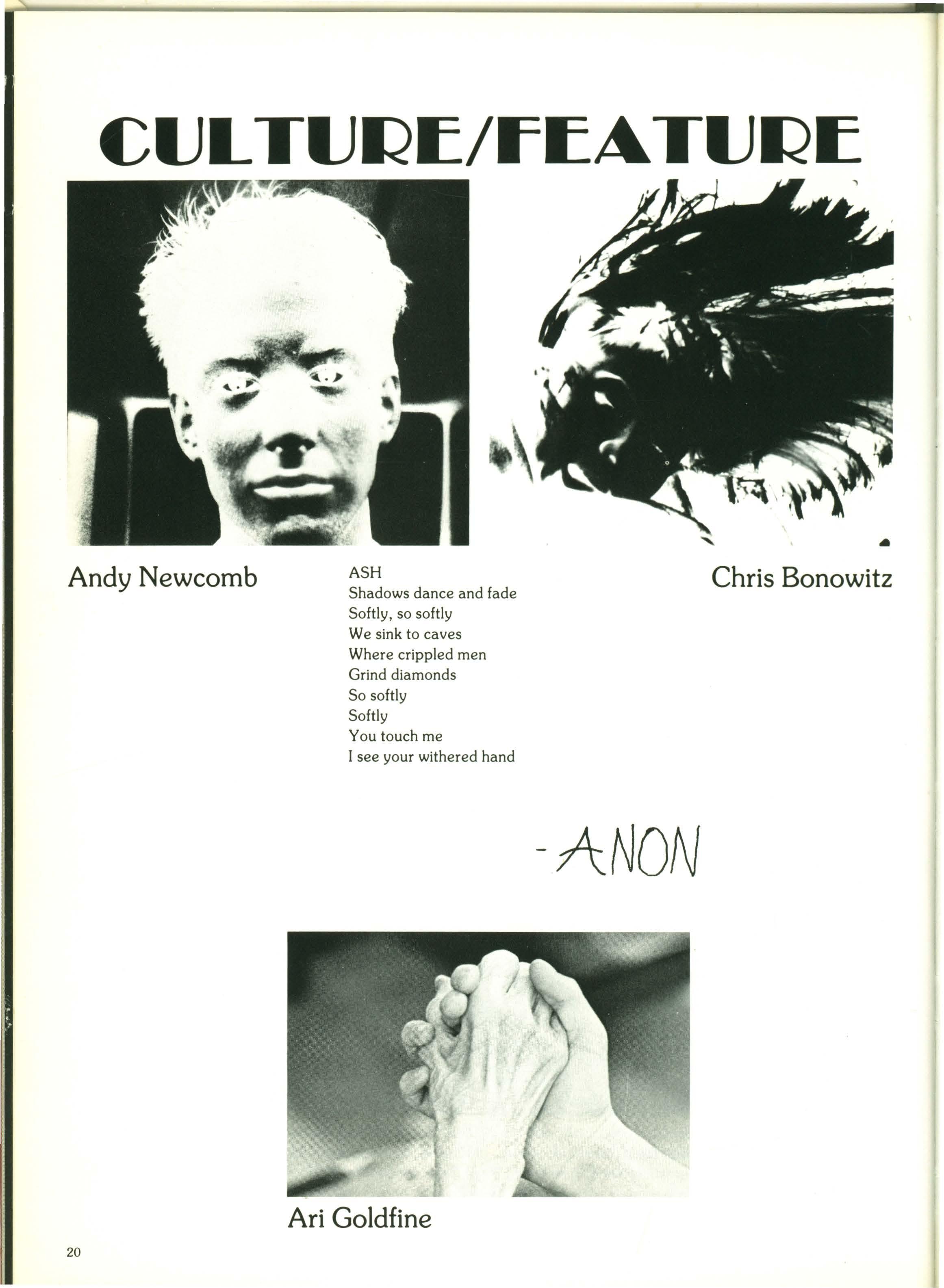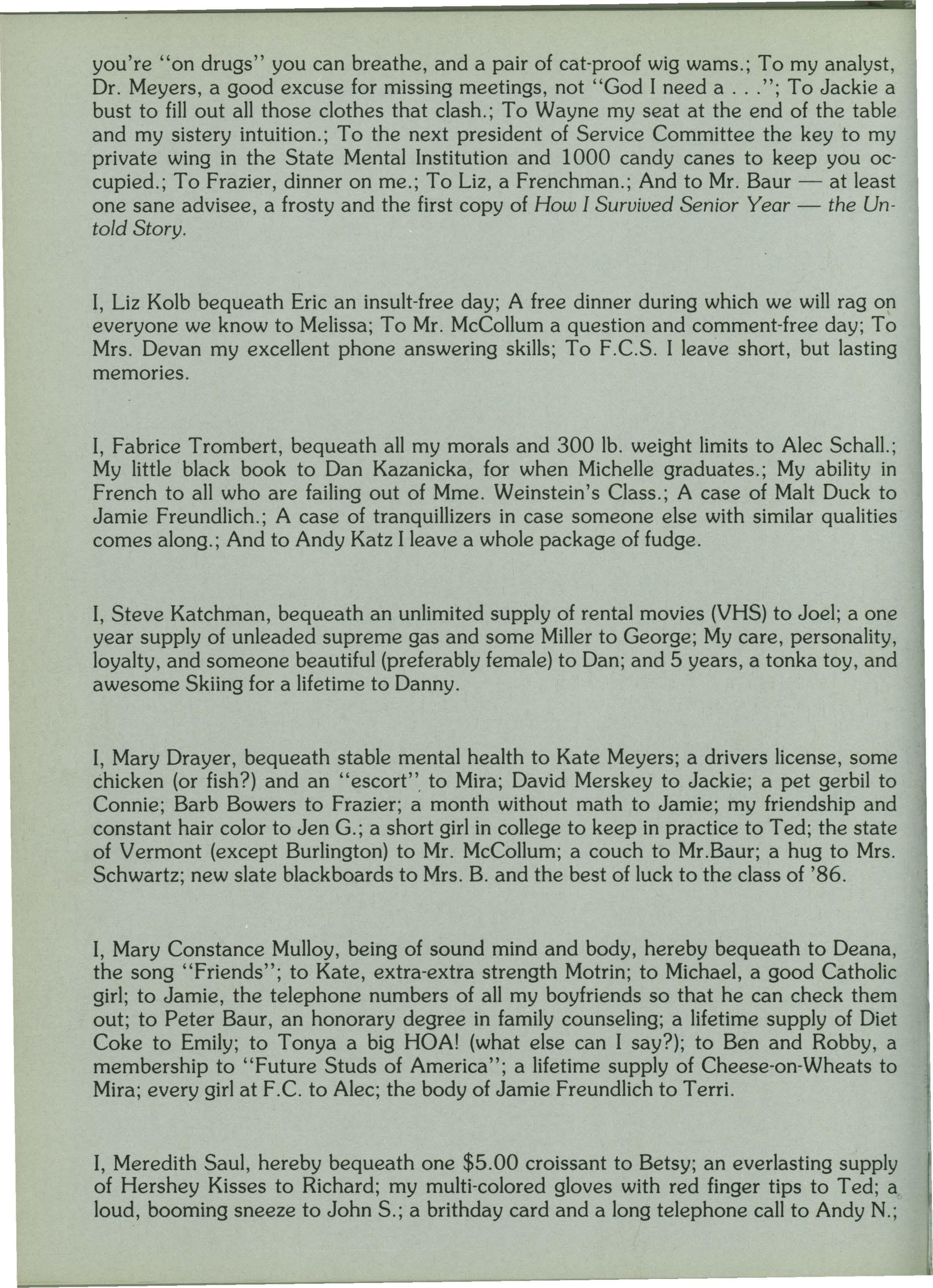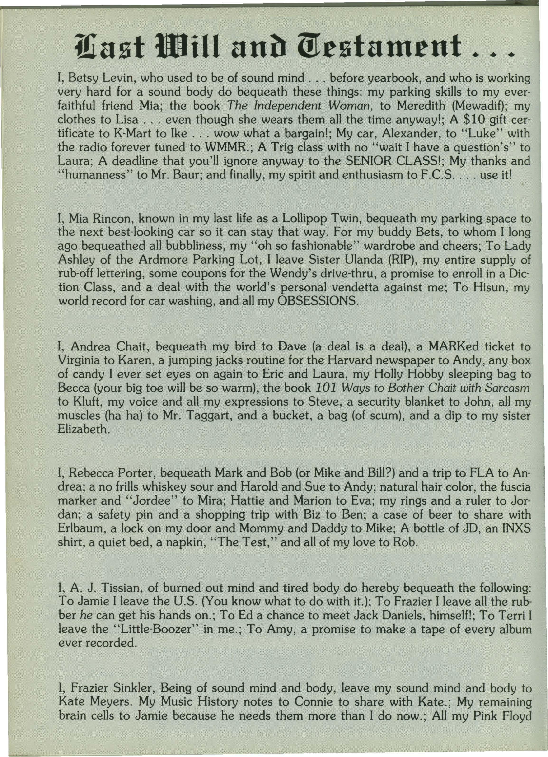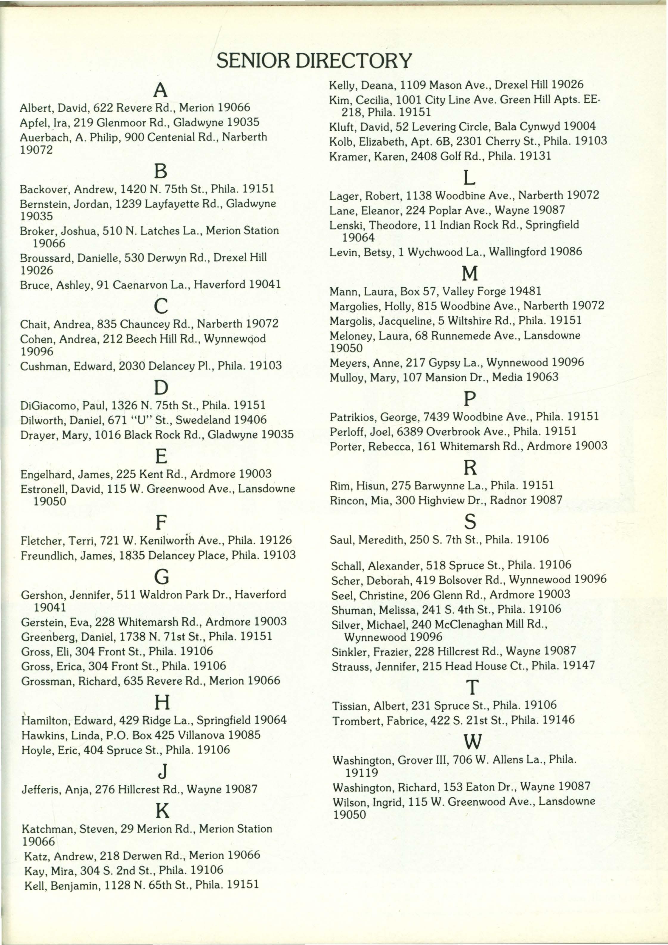 Editors: Andrea Cohen, Karen Kramer. Faculty Advisor: Mr. John McCollum. Assistant Editors: Dave Kluft, Andy Katz, Eric Hoyle, Rebecca Porter, Andrea Chait, Steve Kay, Joel Perloff. Members: Michelle Blum, Melanie Fisher, Jimmy Rutenberg, Ellen Cohen, Maria Farnon, Dan Bernstein, Eric Kramer, Liz Gerst, Matthew Bernstein, Ari Goldfine, Chris Bonovitz, Sara Volkman, Pam Rief, Michael Silver, Andrew Katz, Joel Perloff, Phil Auerbach, Ira Apfel, Dan Dilworth, Sam Hauser, Elizabeth Chait, Liz Freedman, Jordan Bernstein, Laura Mann, Mike Porter, Leah Coplon, Pete Klein, Dan Greenberg, Eric Hoyle, Liz Robbins.