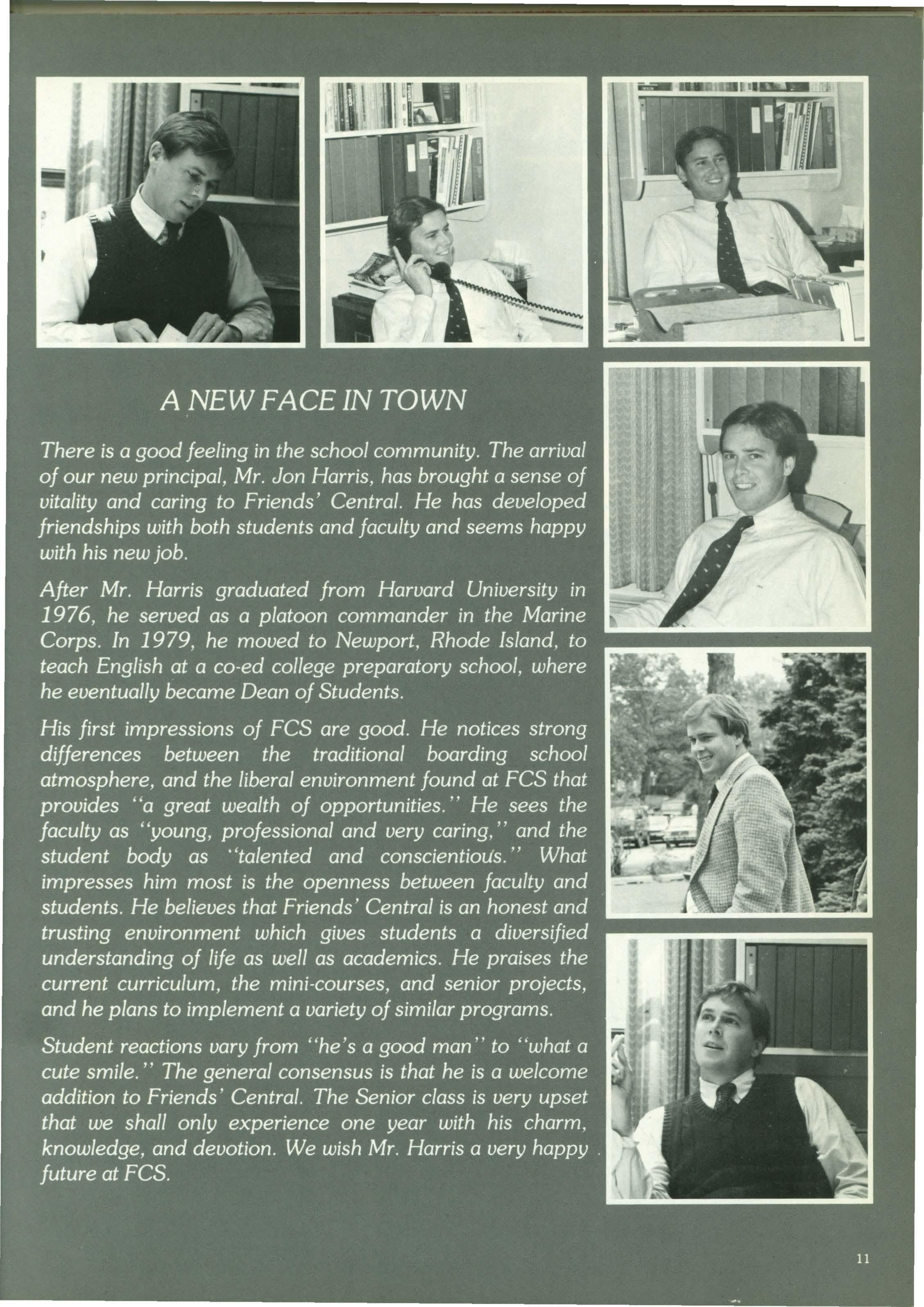 There is a good feeling in the school community. The arrival of our new principal, Mr. Jon Harris, has brought a sense of vitality and caring to Friends' Central. He has developed friendships with both students and faculty and seems happy with his new job.