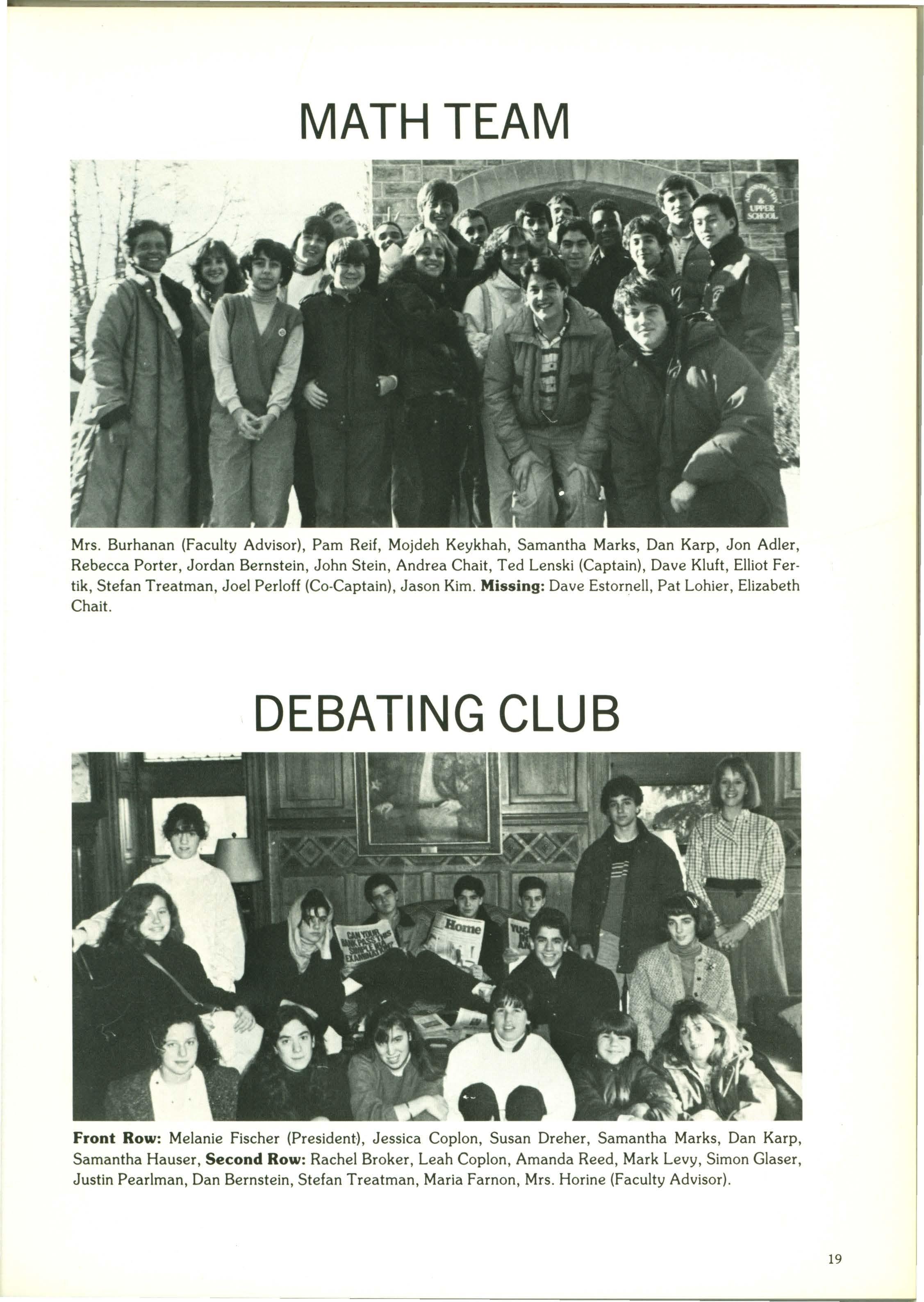Mrs . Burhanan (Faculty Advisor) , Pam Reif , Mojdeh Keykhah , Samantha Marks , Dan Karp, Jon Adler , Rebecca Porter , Jordan Bernstein , John Stein , Andrea Chait , Ted Lenski (Captain) , Dave Kluft, Elliot Fertik , Stefan Treatman , Joel Perloff (Co -Captain) , Jason Kim Missing: Dave Est o rnell , Pat Lohier, Elizabeth Chait.