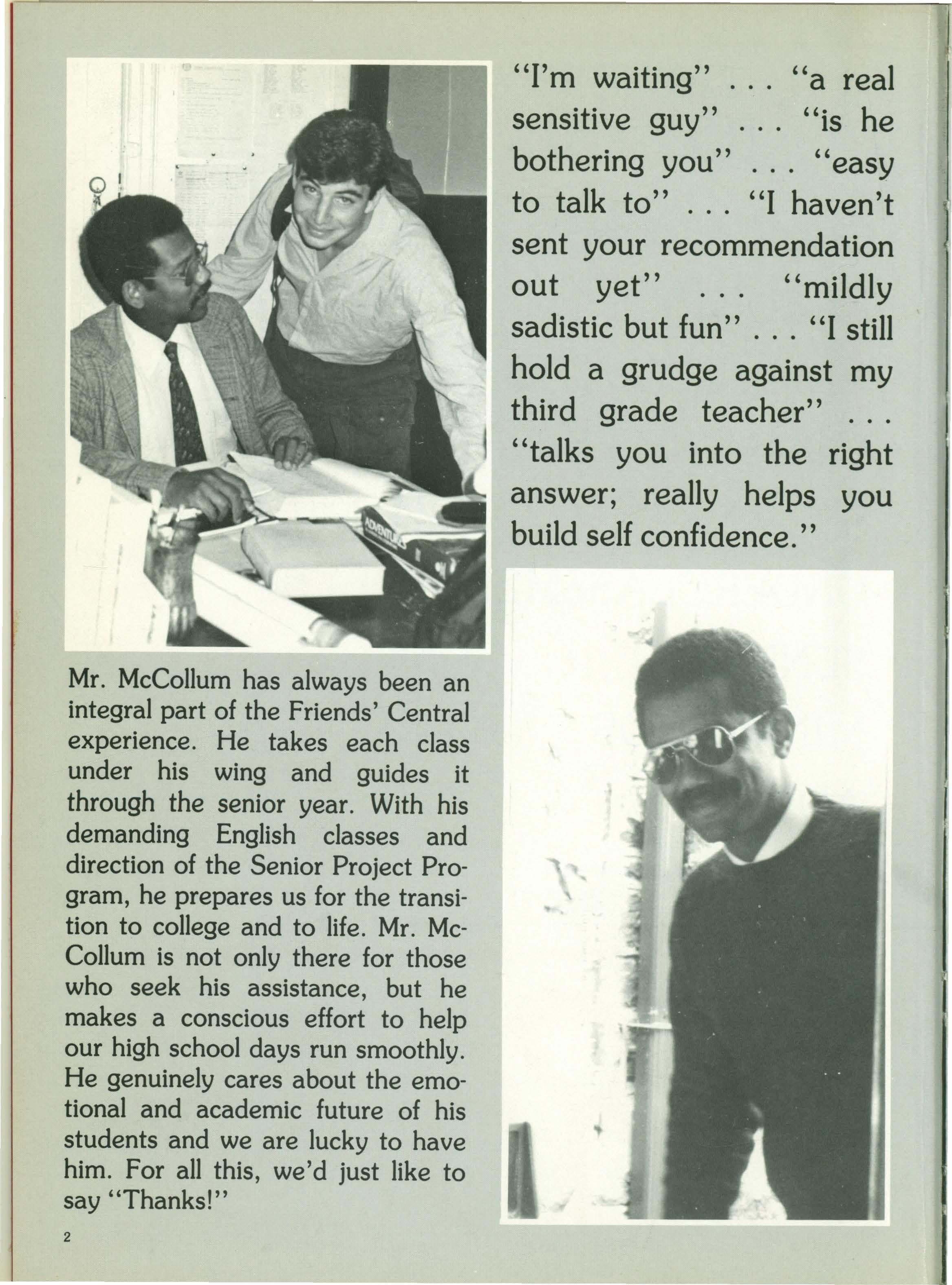 Mr. McCollum has always been an integral part of the Friends' Central experience. He takes each class under his wing and guides it through the senior year. With his demanding English classes and direction of the Senior Project Program, he prepares us for the transition to college and to life. Mr. McCollum is not only there for those who seek his assistance, but he makes a conscious effort to help our high school days run smoothly. He genuinely cares about the emotional and academic future of his students and we are lucky to have him. For all this, we'd just like to say "Thanks!"