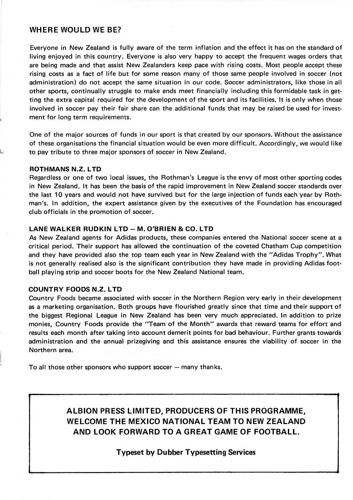 This match programme was published for the international friendly between New Zealand and Mexico on August 20, 1980. New Zealand, under new head coach John Adshead, won the match 4-0 at Bill McKinlay Park, Mt Wellington, Auckland. More information about Friends of Football: www.friendsoffootballnz.com