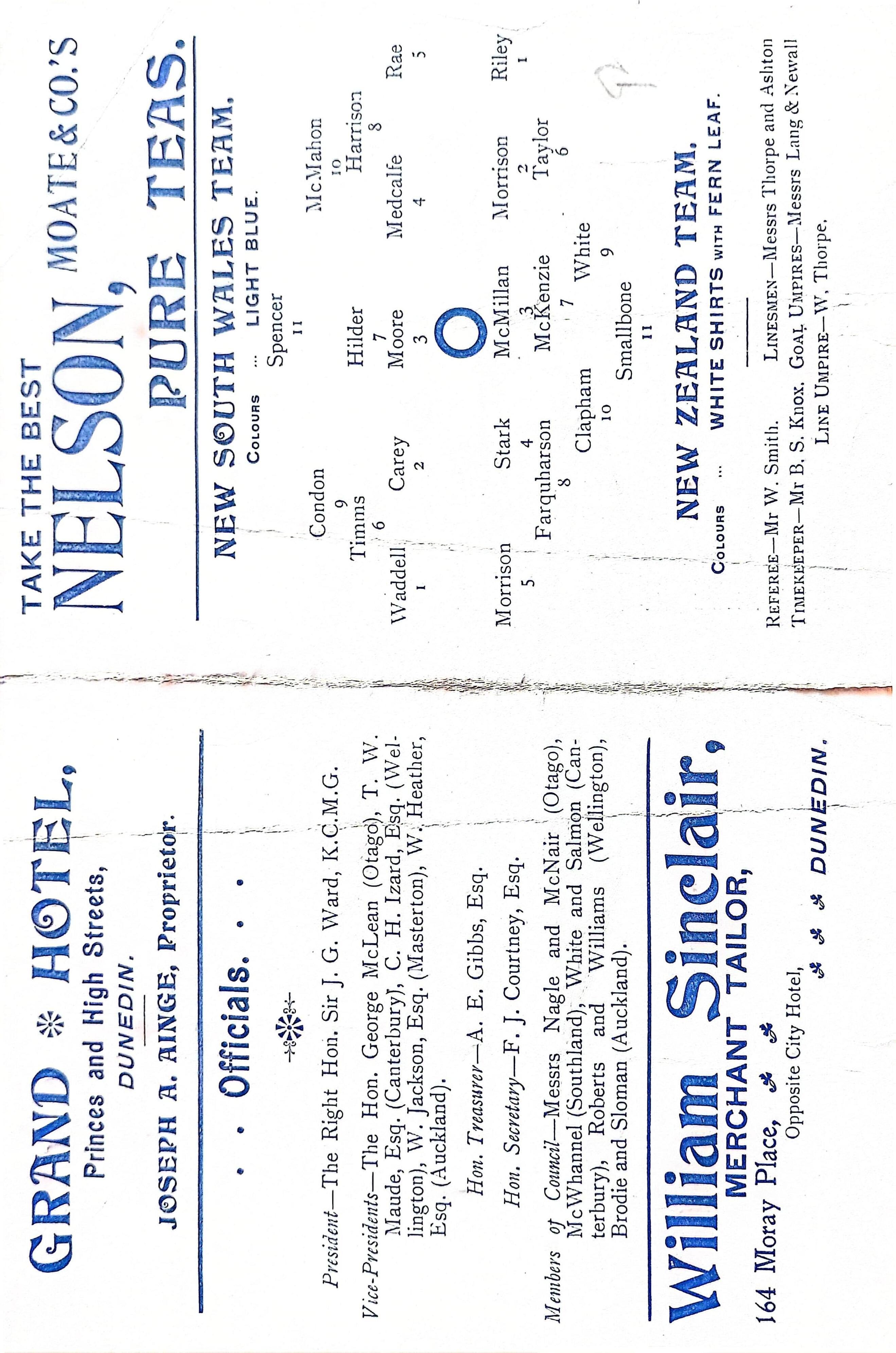 This match programme was produced for the July 1904 game between New South Wales and New Zealand. Thanks to Norm McRobbie for providing this publication for digitisation by New Zealand's Friends of Football organisation. More: www.friendsoffootballnz.com