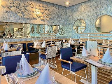 Wer würde nicht mit so einem Pfund wuchern: Als Sieger in der Koch-Show „Mein Lokal, dein Lokal“ auf Kabel1 TV lässt es sich das Wiesbadener Restaurant „Pescaletta“ nicht nehmen, schon an der Eingangstreppe neben einer sympathischen lebensgroßen Kapitänsfigur eine handbeschriebene Schiefertafel aufzustellen, die den Spaziergänger auf die gastronomische Auszeichnung aufmerksam macht. Das Restaurant befindet sich im wunderschön renovierten Gebäude des Hansa-Hotels und präsentiert sich ganz im Stil eines kleinen Kreuzfahrtschiffs: Schon am Eingang trifft der Blick durch ein großes Bullauge auf zwei mit Sand und zahlreichen Muscheln und Seesternen gefüllte Terrarien, darüber prangt ein großes blaues Steuerrad. Das Personal trägt Uniformen von Schiffsoffizieren mit dreistreifigen Schulterklappen, die deckenhohen, in Blautönen gehaltenen Tapeten und die dunkelblauen Polster auf Stühlen und Bänken sowie ein riesiger Schwarm aus silbernen Metallfischen an einer der Wände lassen keinen Zweifel am Schwerpunkt des Restaurants aufkommen. Die Webseite verspricht eine kulinarische Kreuzfahrt und die Speisekarte präzisiert auch die Seeroute: Es geht durch vier Anrainerstaaten des Mittelmeers, von Spanien über Frankreich und Italien nach Griechenland.