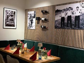Die Gasträume sind auf zwei Ebenen angeordnet: Auf dem Niveau des Eingangs finden sich zwei größere Tische, zwei Bartische für je zwei Personen und der Tresen mit großer Kaffeemaschine und einem wunderbar beleuchteten und bis an die Decke reichenden Weinregal. Auffallend sind auch das große Schwarz-WeißFoto an der Wand, auf dem eine ein Pastagericht genießende italienische Schönheit zu sehen ist, sowie der üppige Kronleuchter, der in der Mitte des Raumes schwebt. Um zum größeren der beiden Gasträume zu gelangen, muss man wenige Stufen gehen: Hier erwarten uns Wandbänke und Stühle mit geschmackvollen Velourspolstern an mit kleinen Stehleuchten und Blumen dekorierten Tischen. Die zur Lärmdämmung an den Wänden angebrachten Holzpaneele zeigen weitere Schwarz-Weiß-Fotos mit ländlichen Motiven, u.a. auch zwei Fotos, die die beiden Inhaberfamilien in ihrer Epoche zeigen.