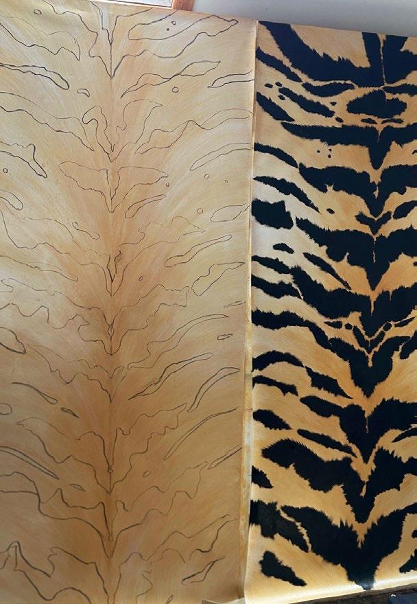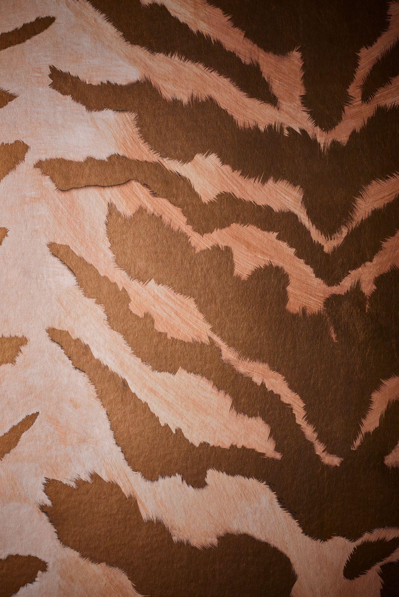 The tiger pattern is used as a maquette for Fromental’s distinctive cut velvet technique. A hand-brushed ombré is applied to a rich velvet pile before our tiger motif is precisely cut into the surface. For added depth and drama, elements of the pattern are then gilded into the pile. Complementing the wallcoverings, these soft furnishings carry the collaboration into three dimensions, translating Reed’s expressive vision into tactile form — immersive, intimate, and unmistakably Harris.
