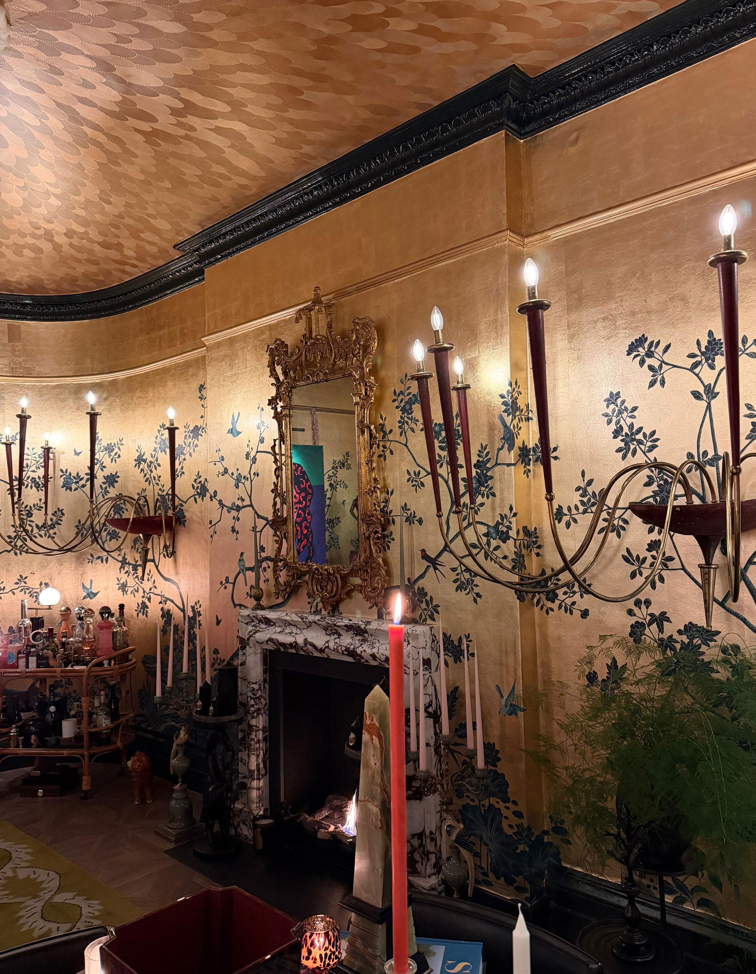 Quite naturally, we turned to golden gilding. Installed here across the walls of Harris Reed’s living room, the surface captures and reflects light, lending the space an unexpected serenity, particularly in the afternoon, when sunlight pours through the bay windows and bathes the room in its warmth.