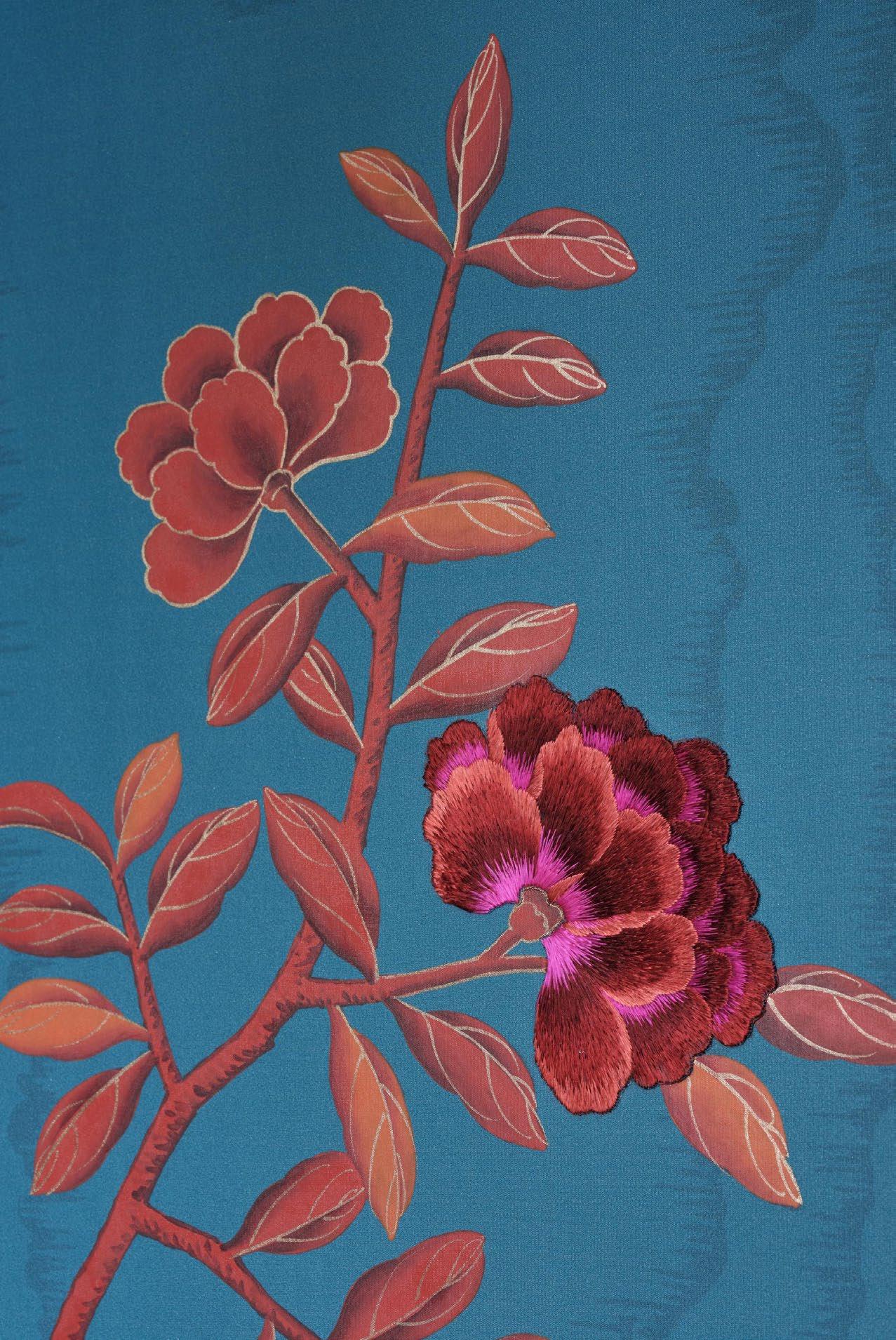Twisting groves of hand-painted, flowering trees climb skywards against a moiré silk ground. Branches are crowned with peonies in varying stages of bloom, their most mature forms, if so desired, embellished with exquisite silk embroidery. Swallows, bees, and butterflies skim across lily-strewn ponds before weaving through the foliage.