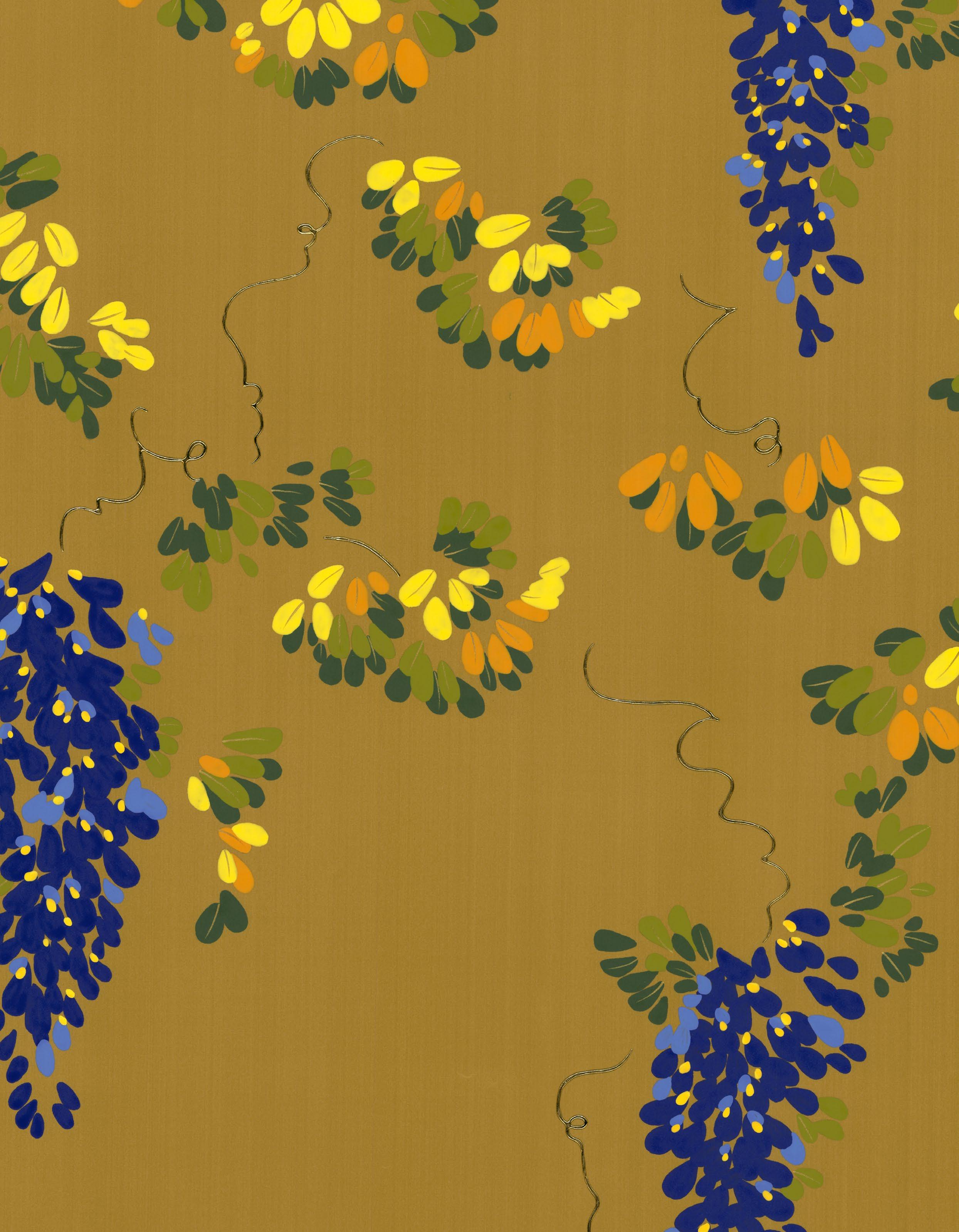 Evocative of its namesake’s cascading lilac blossoms, clusters of petals are hand-painted on silk with expressive, intuitive brushwork and accented with touches of gold foil. Drifting gracefully from above, the composition captures the vine in full summer bloom, alive with movement and vitality.