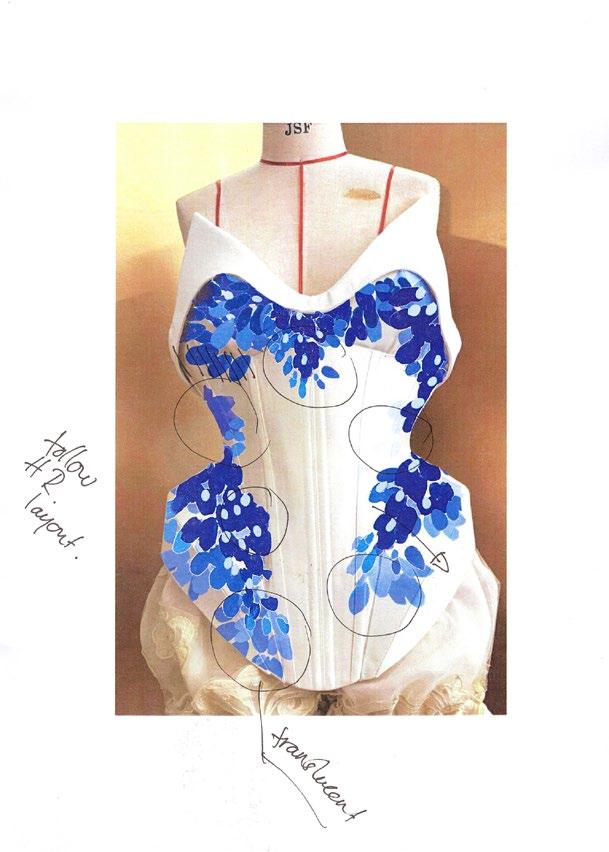 The final, handfoiled detail applied to a bodice painted in Whispering Wisteria’s signature ellipses. Harris Reed Spring Summer 2026, The Aviary