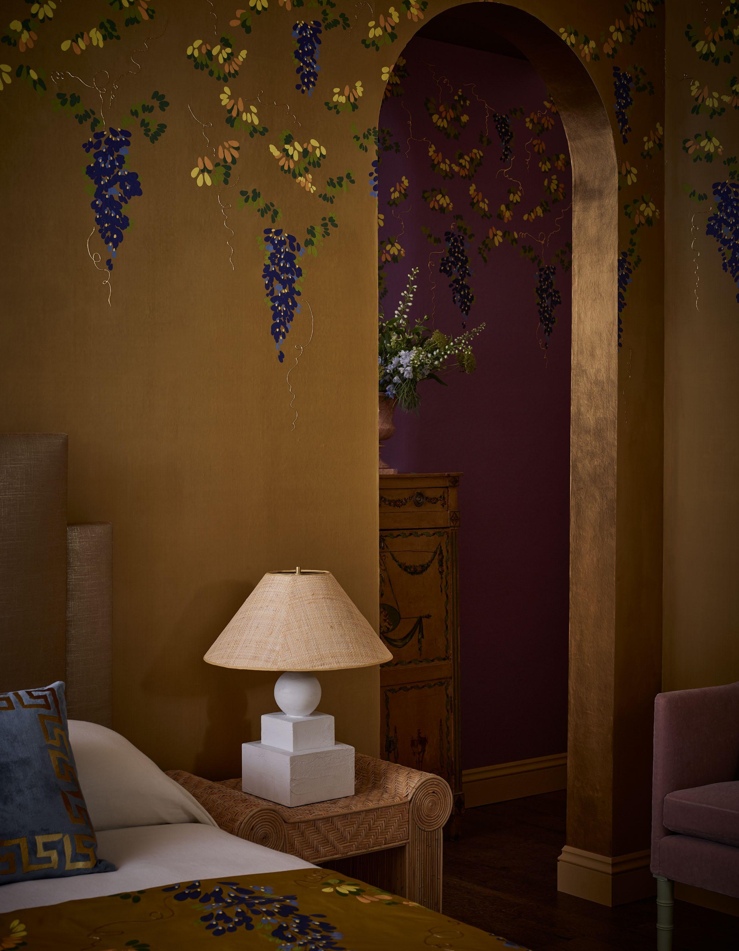 OPPOSITE Whispering Wisteria in Gilded Chartreuse wraps the entirety of a master bedroom, the same design in Parma Violet deepening the adjoining space.