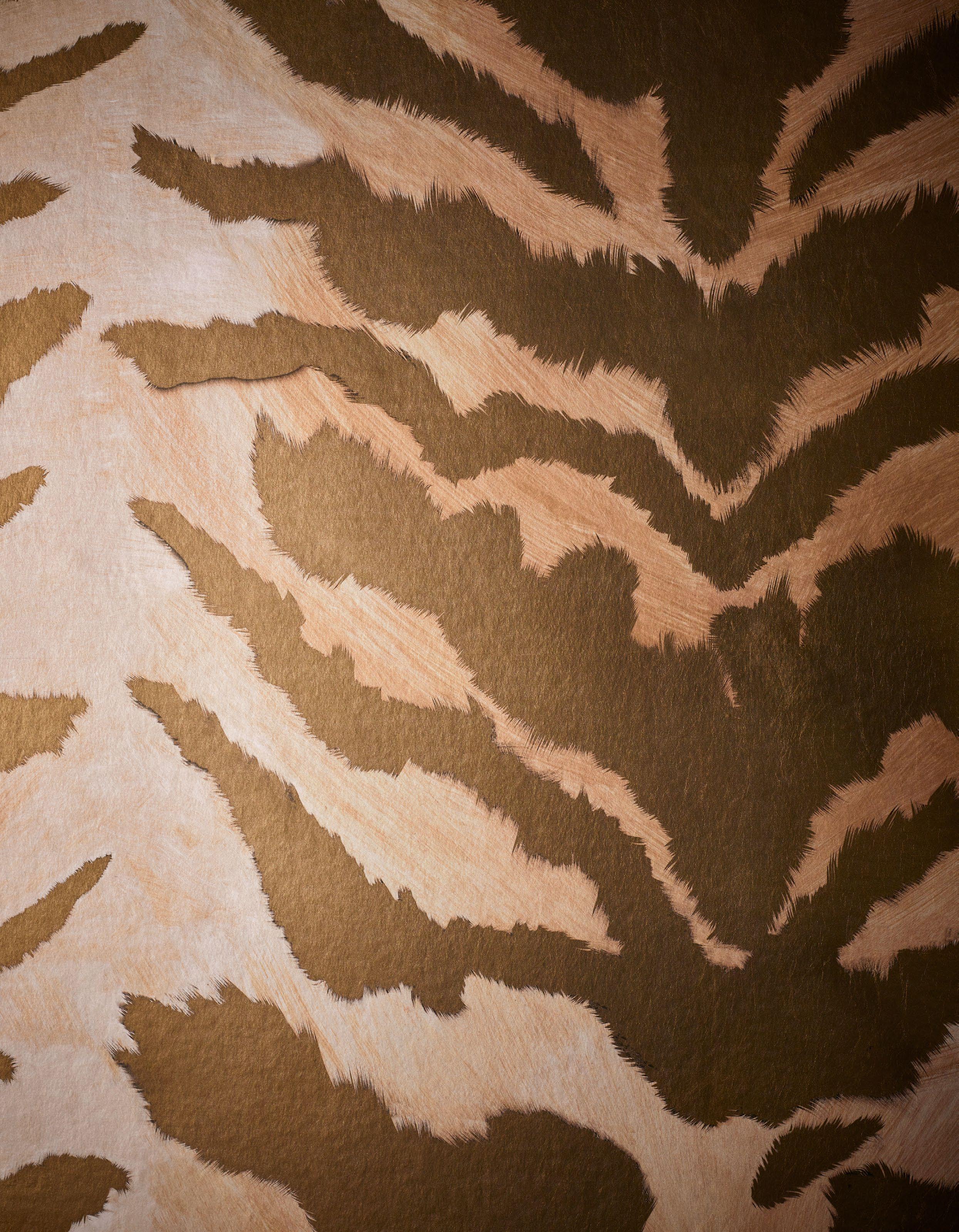Framed by ornate mouldings and classical columns, the design plays on the tension between untamed beauty and refined taste in this opulent drawing room. Here, evenings unfold by candlelight — conversations linger over rare spirits and laughter echoes across coffered ceilings, as metallic tiger stripes catch the glow and flicker with every movement.