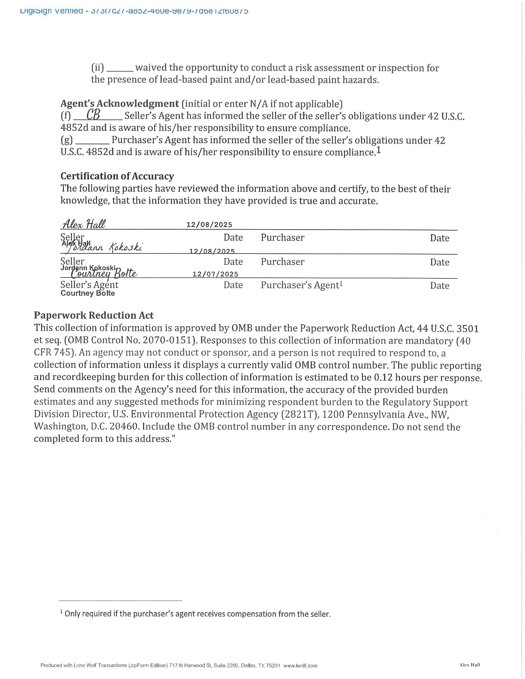1 Only required if the purchaser's agent receives compensation from the seller.