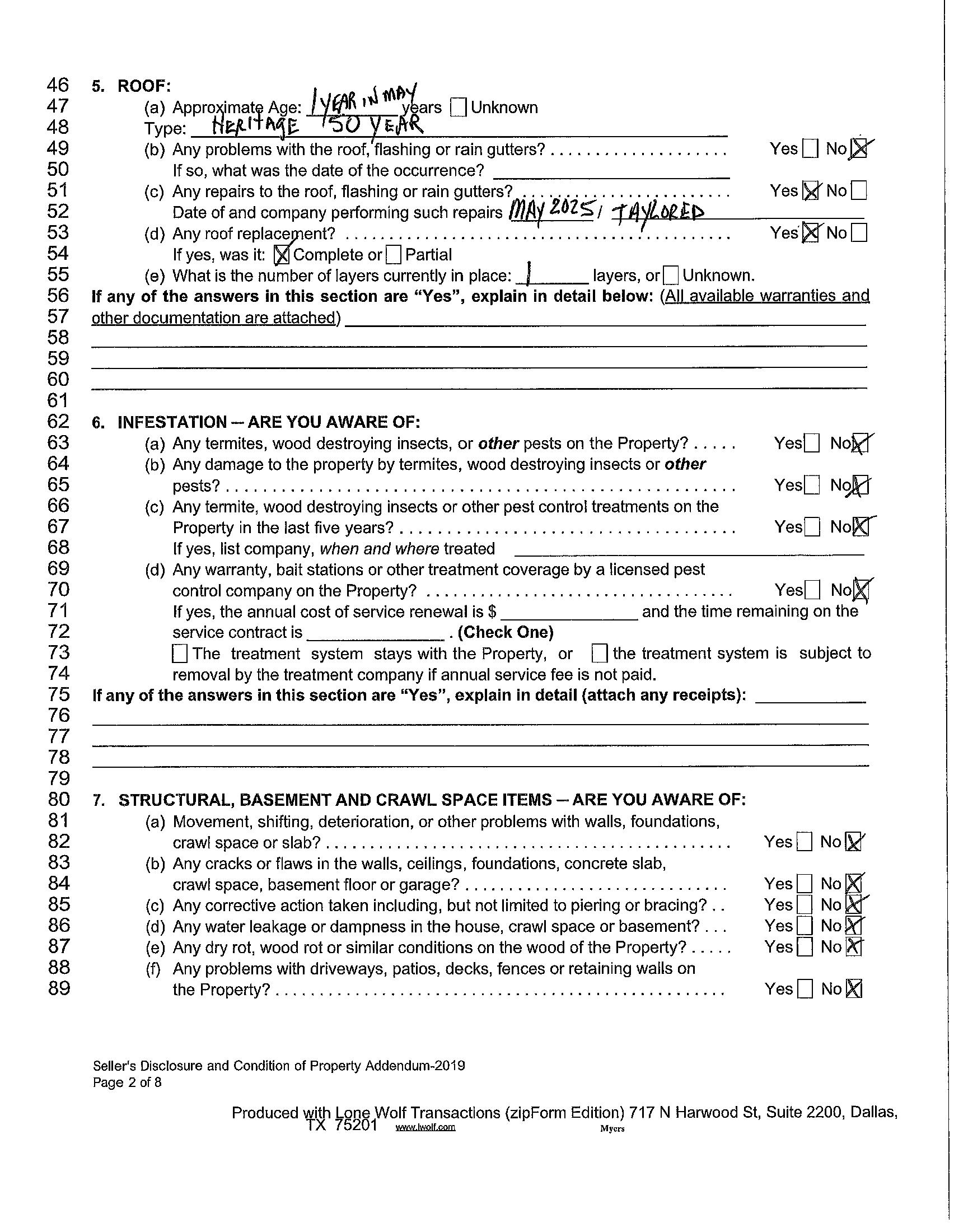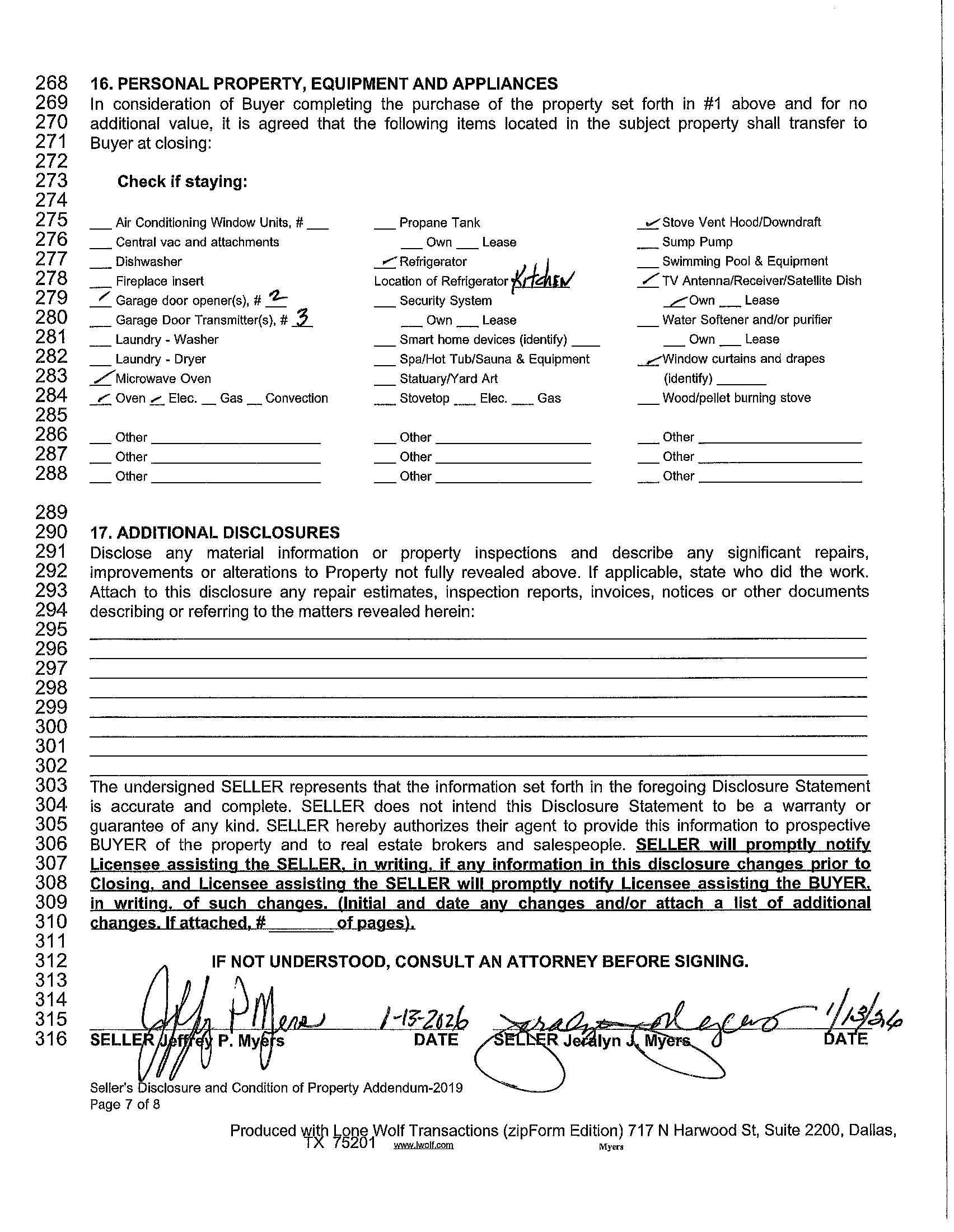 This is a disclosure of SELLER'S knowledge of the Property as of the date signed by SELLER and is not a substitute for any inspections or warranties. It is not a warranty of any kind by SELLER or a warranty