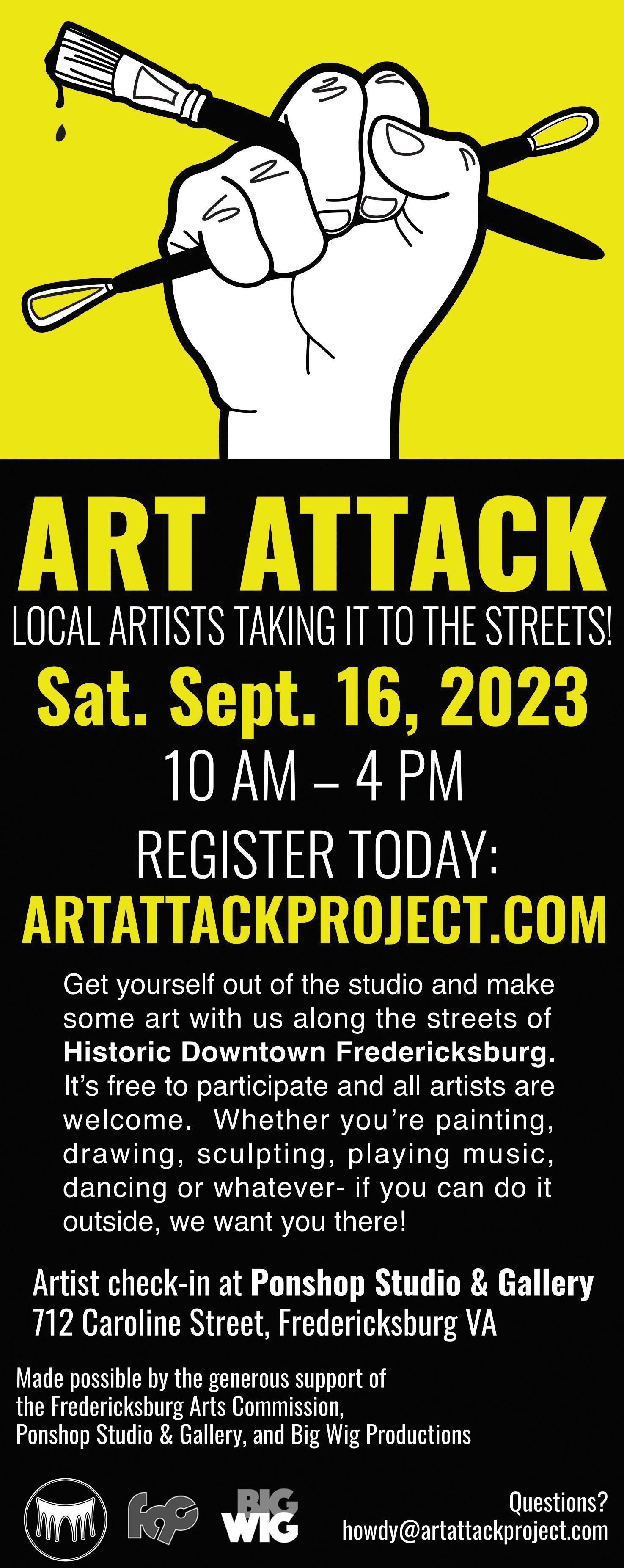 Tenth Annual Art Attack Event Announced Local artists taking it to the streets in Historic Downtown Fredericksburg! Saturday, September 16, 2023 10 AM - 4 PM