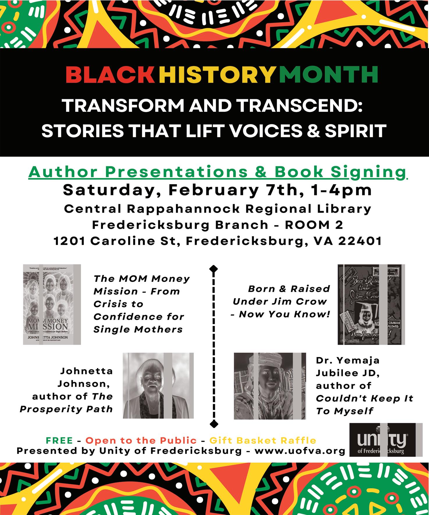 TRANSFORM AND TRANSCEND: STORIES THAT LIFT VOICES & SPIRIT Book signing , February 7, 1-44p Central Rappahannock Library Caroline Street , Downtown Sponsored by Unity of Fredericksburg Both authors' books are available for purchase on Amazon