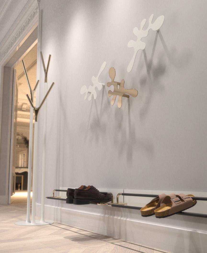 Matt Black and Matt White. The shoe rack’s polished stainless steel parts comes in Polishes Gold, Polished Copper, and Polished Stainless Steel.