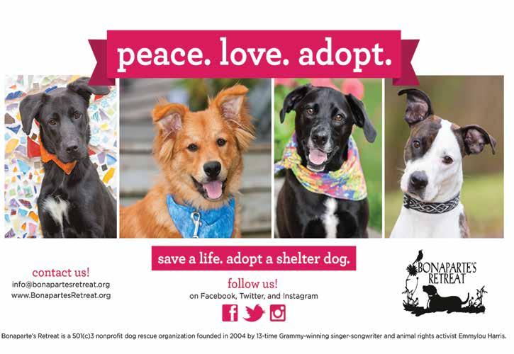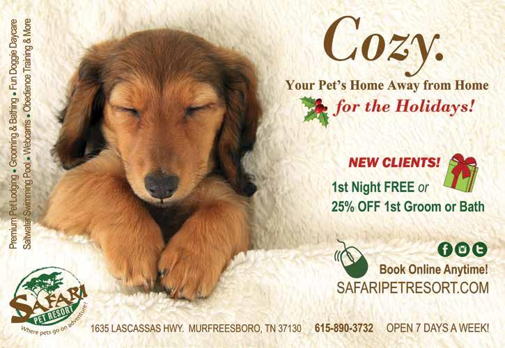 October November 2016 33 www.NashvillePaw.com AEI Windows.................................................................................... 19 Agape Animal Rescue 18, 36 All Animals Pet Care LLC 37 Animal Emergency at Nashville Vet Specialists .................. 40 Animal House Veterinary Clinic ................................................ 35 Animalia Health + Wellness ....................................................... 02 Barktoberfest 03 Bonaparte’s Retreat................................................................... 19, 37 Camp Bow Wow ............................................................................. 35 Crossroads Pets Shop & Adopt ................................................. 25 EarthWise Pet 33 Farm at Natchez Trace, The 9 Farmer’s Insurance Group .......................................................... 37 Fresh Canine .................................................................................... 24 Happy ReTalesPet Supply ........................................................... 11 Home Run Pet Care 36 James Covington, Real Estate Agent 37 Keke’s Dog Bakery + Boutique .................................................. 04 Licker + Whine Pet Market ......................................................... 06 Maggie Odle, Real Estate Agent ............................................... 37 Michelle Conner Pet Photographer 36 MoonDog Handmade Goods 25 Nashville Holistic Pet .................................................................... 35 Nashville Pet Emergency Clinic ................................................ 31 Patricia Gartland, Real Estate Agent ....................................... 34 Pet Must Haves Warehouse 13 Rutherford County PAWS............................................................ 32 Safari Pet Resort ............................................................................. 23 State Paws / Poo Doo Leash ...................................................... 06 Three Dog Bakery 24 Treat Me Good Dog Barkery 35 Two Men And A Truck .................................................................. 13 VIP Petcare ....................................................................................... 04 Woof Gang Bakery + Grooming ............................................... 23 Reach 50,000 pet lovers in our HOLIDAY ISSUE! Ad deadline is October 21. Call Heather at 615.474.5710 or email info@nashvillepaw.com. advertising directory