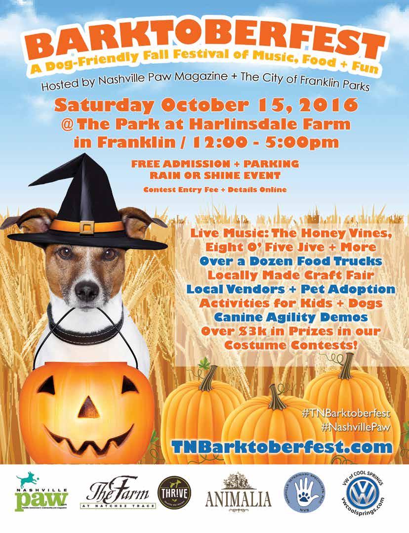 Celebrating its 8th year, Barktoberfest is Middle Tennessee’s dog-friendly fall festival of music, food and fun! Hosted by Nashville Paw magazine in partnership with the City of Franklin Parks, the event is held at the gorgeous Park at Harlinsdale Farm. Last year, this fast growing festival welcomed over 11,000 guests and their pup pals! Barktoberfest won third place for “Best Festival” in The Tennessean’s 2013 Toast of Music City Awards. Live music will include The Honey Vines and Eight O’ Five Jive, and guests will enjoy over a dozen food trucks and 40+ local vendors. As always, we’ll have local rescue groups on site for meet-and-greets with adoptable pets, and plenty of activity for the kids and dogs. This year, we are excited to introduce a new local craft fair as well, featuring locally made arts, crafts and products for sale. Of course, the highlight of Barktoberfest is always the costume contests for kids, dogs and adults— and we’ll be giving out more than $3,000 in fun prizes to the winners! General festival admission and parking is free. Contest entry fees and details on website. This event is rain or shine. 615-474-5710, tnbarktoberfest.com