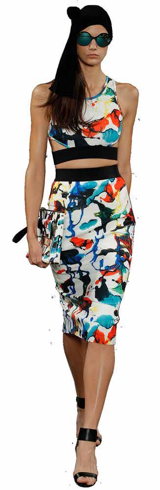 MILLY’S MULTI-COLORED MIDI SKIRT AND CROP TOP MAKES A BOLD FASHION STATEMENT FOR SPRING WWW.MILLYNY.COM L.K. BENNETT'S MULTICOLORED LEATHER PUMPS FROM NEIMAN MARCUS ARE A SPRING FASHION