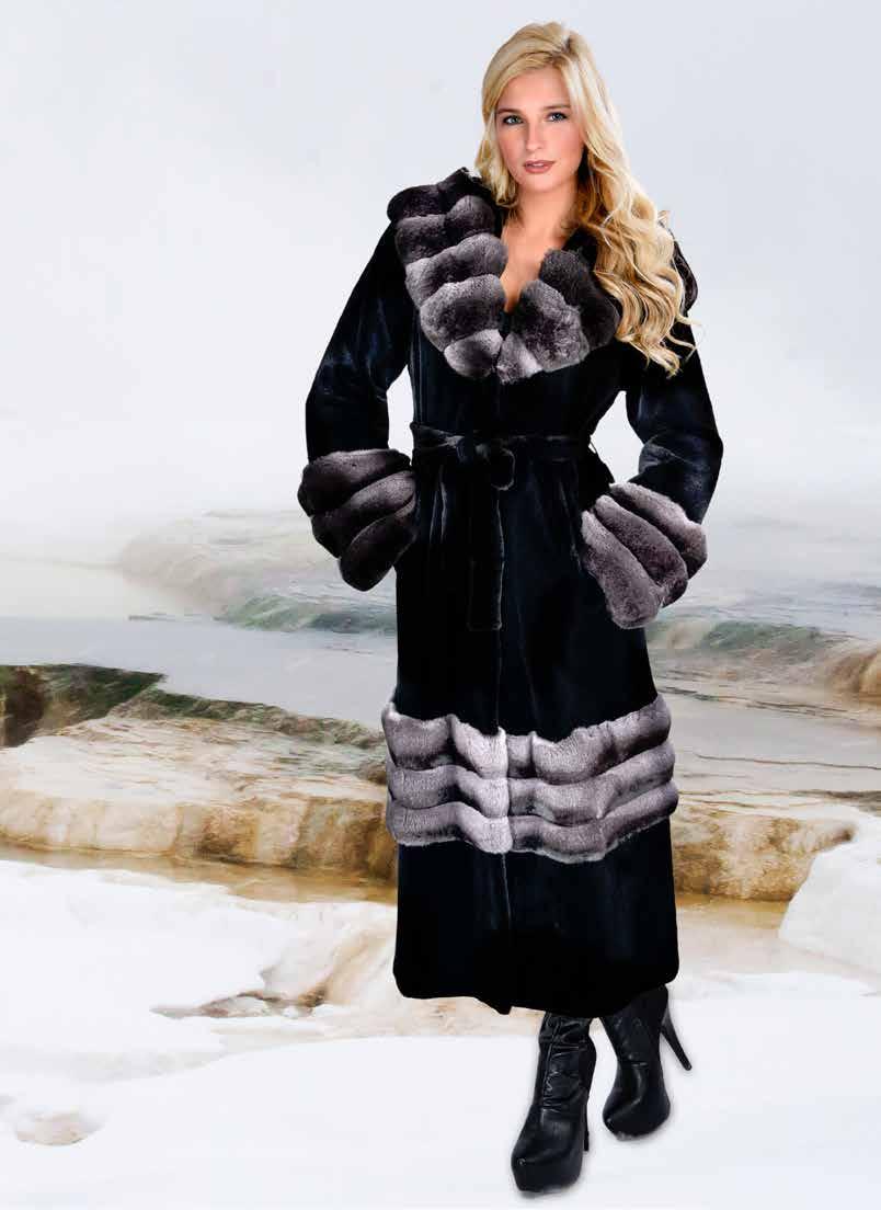 Our Model is wearing a Black Dyed Sheared Mink Coat with Chinchilla Trim, Hood and Belt. 50 inches in length Fur origin: Denmark