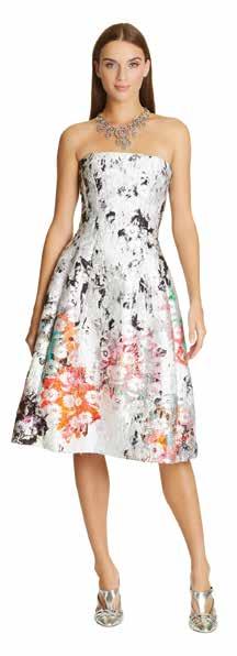 OSCAR DE LA RENTA’s strapless multicolored print dress is a summer fashion essential for day or night. Add a touch of glamour with a crystal statement necklace and black silk party pumps www.oscardelarenta.com