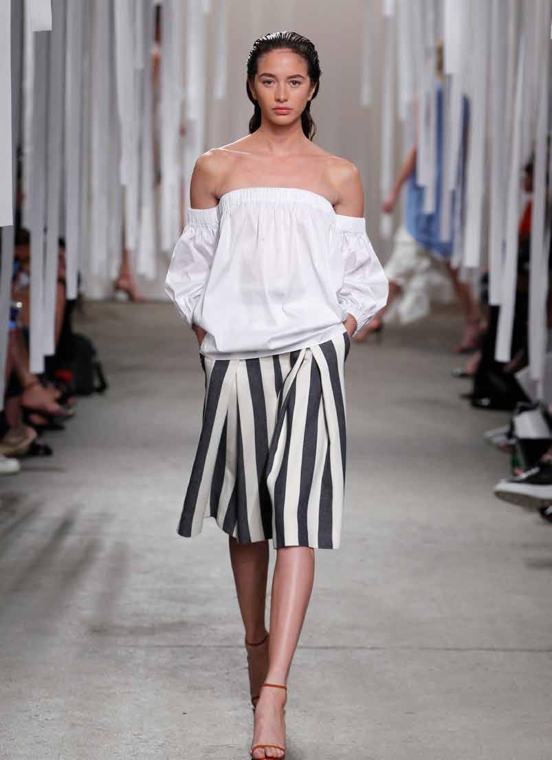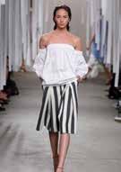 What we like most about the summer season are the carefree and relaxed designer fashion collections that are so chic. A warm-weather designer fashion favorite that’s perfect for summer days or nights is Milly’s trendy white cotton offthe-shoulder top that’s paired with a bold black and white striped cotton culotte skirt. Add a touch of easy elegance to this stylish summer ensemble with a pair of vivid red leather sandal heels, a pair of crystal statement earrings and a summery straw clutch. To view the Milly 2016 designer fashion collections, visit Milly’s online fashion boutique at www.milly.com UT