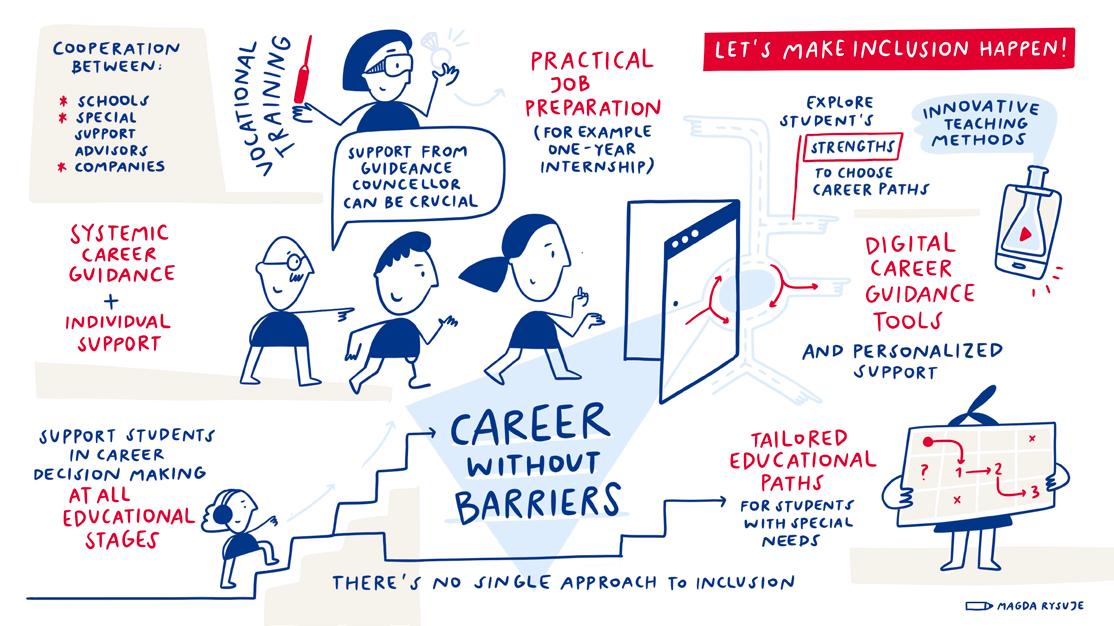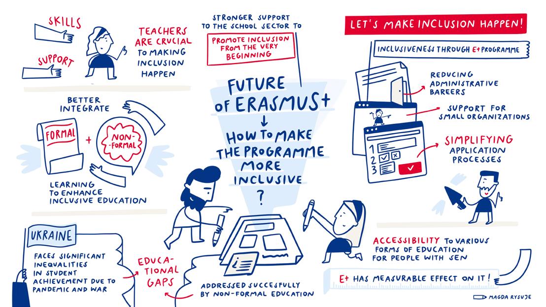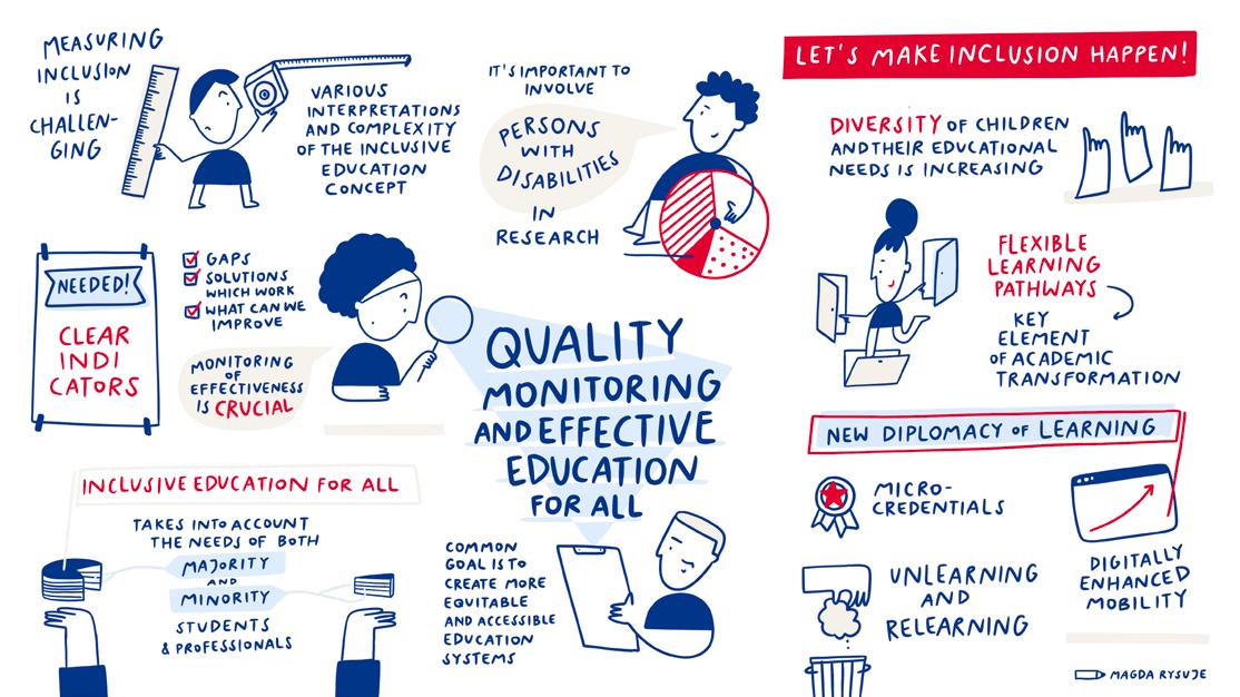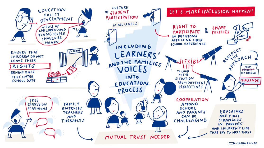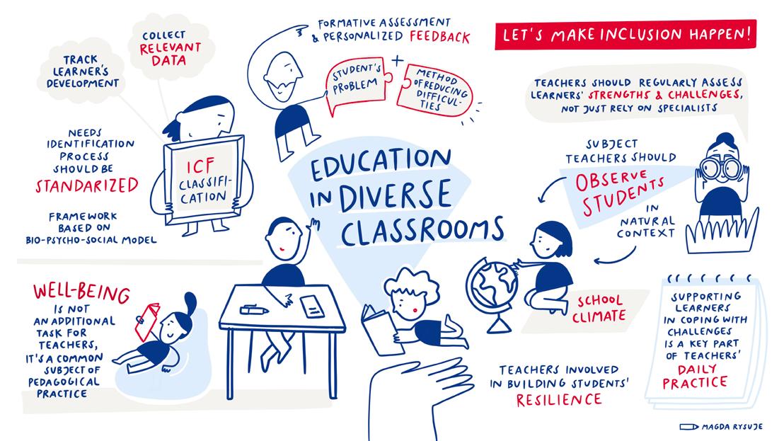 Visual notes are a creative method for capturing key messages, recommendations, and central ideas using both text and illustrations. Sketchnotes combine words with visual elements – such as images, arrows and shapes – to facilitate understanding and effective memorisation of information. During the conference “Let’s make inclusion happen!”, the talented graphic artist Magdalena Arażny was tasked with creating visual records of the debates, discussions and presentations. Her live notes illustrate the interrelated issues, programmes, models, and expert solutions presented during the conference in a clear and appealing way. We hope that translating these ideas into visual form will help readers of this publication better understand how joint actions can make inclusive education a reality!
