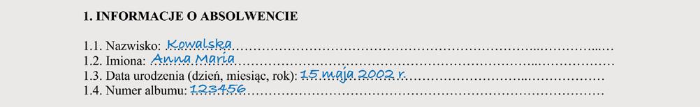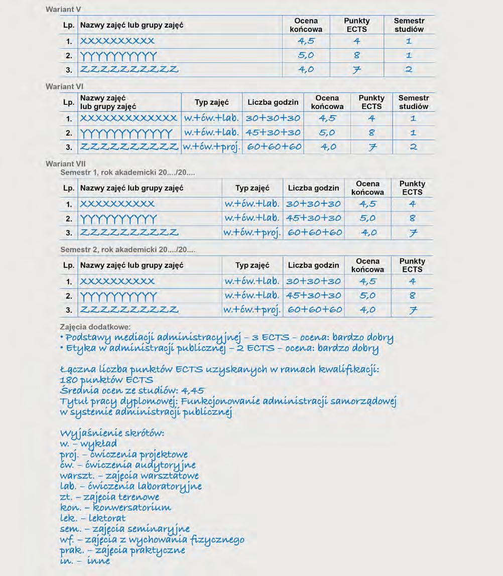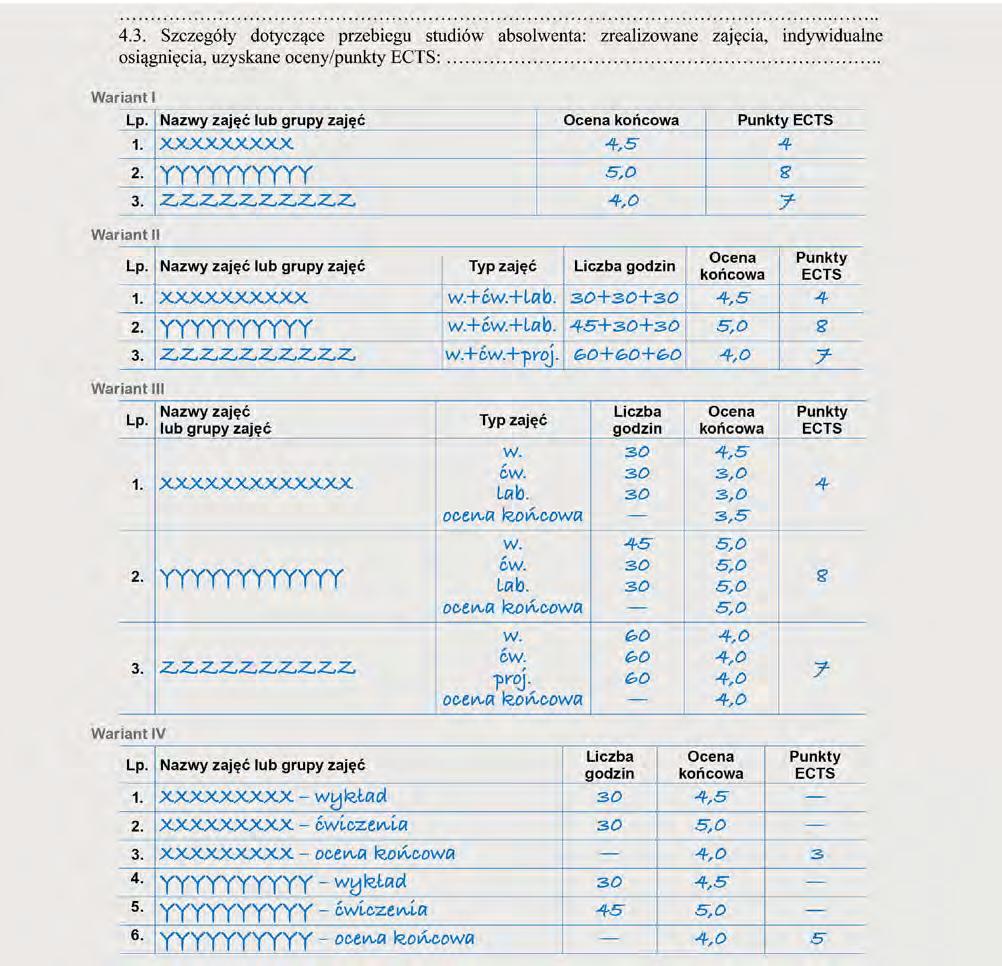 y wskazuje punkty z możliwością rozszerzenia o dodatkowe strony, jeżeli jest to konieczne dla pełnego przedstawienia przebiegu studiów absolwenta.
