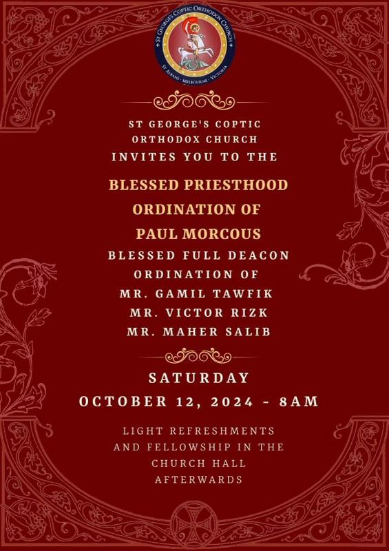 Saturday 19th October – 9 AM – Liturgy at St Macarius’ Church – ordination of deacon