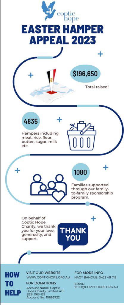 On behalf of Coptic Hope Charity, we would like to thank you for your love, generosity and support. For further information please call Nagy Banoub on 0423 411 715 or email: info@coptichope.org. au