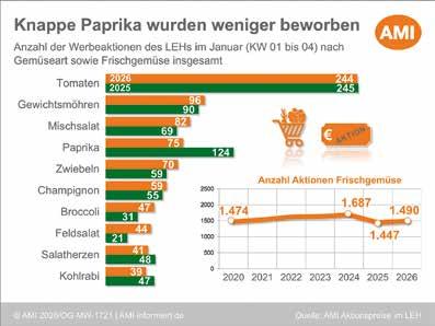 Die Nachfrage nach Möhren ist saisonüblich hoch. Die kalte Witterung macht weiterhin Lust auf deftige Gerichte, die Neujahrsvorsätze waren im Januar noch präsent und die Frischeabteilung im Lebensmitteleinzelhandel bietet eine winterlich reduzierte Auswahl an Obst und Gemüse. Da punkten Möhren auf ganzer Linie. Mit 18 Aktionen für konventionell erzeugte Möhren wurde in der 4. Woche leicht mehr geworben als im Durchschnitt der fünf Vorjahreswochen. Für die hohe Anzahl an Aktionen stehen in Deutschland erzeugte Möhren ausreichend zur Verfügung, doch die Lagerbestände schrumpfen. Sowohl bei Bio-Möhren als auch bei konventionell erzeugten Möhren wird von einer zumindest durchschnittlich langen Importsaison ausgegangen. Durch die Frosttage im Januar kam es zu Verlusten, die sich zwar einzelbetrieblich, jedoch nicht auf den Gesamtmarkt auswirkten.