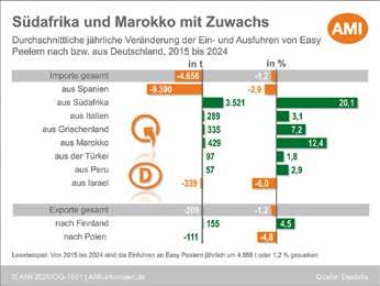 schneller endete. In allen Anbauregionen wurde daher früher mit der Ernte der Spätsorten wie Nadorcott, Tangos und ähnlichen Sorten begonnen. Diese Früchte müssen jedoch noch nachreifen, sodass insgesamt nicht die geplanten Mengen für den Verkauf verfügbar sind. An den deutschen Großmärkten greift der Großhandel neben spanischen Easy Peelern nun verstärkt auf Ware aus Marokko und Israel zurück. Die Preise bleiben über das gesamte Sortiment hinweg weiterhin stabil.