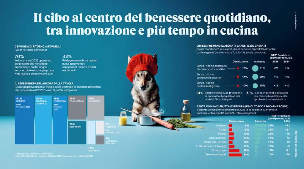 Un bagno di realtà È così che il Rapporto Coop Winter Edition descrive l’approccio degli italiani al 2026, un anno percepito come complesso, instabile, segnato da tensioni geopolitiche, disuguaglianze s o c i a l i e c a m b i a m e n t i c l i m a t i c i che incidono in modo diretto sull’economia e sul vissuto quotidiano La preoccupazione è il sentimento prevalente (37%), seguita dall’insicurezza (23%), anche se non manca una quota di resilienza: un italiano su quattro continua ad aggrapparsi all’ottimismo, mentre curiosità e fiducia restano ancorate soprattutto alla sfera personale e familiare È qui che il cibo assume un ruolo centrale, come spazio di controllo, benessere e scelte consapevoli.