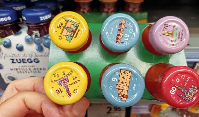 In questo caso, è proprio il legame tra prodotto e origine certificata che muove la proposta promozionale spingendo il consumatore ad attivarsi grazie a una call to action precisa e coerente “Tutte le mie città” e un claim che non ammette fraintendimenti “La collezione che fa girare l’Italia”. L’oggetto da collezionare è il tappo che, numerato e variamente colorato, diventa promotore delle differenti città italiane attraverso un design moderno che ne illustra la principale attrazione È chiaro come attraverso questa dinamica si attivino da un lato il bisogno, in primis, di trovare la propria città di riferimento (che sia quella natale o quella di elezione), e poi quello di completare il set di tappi assecondando così un “effetto ri-