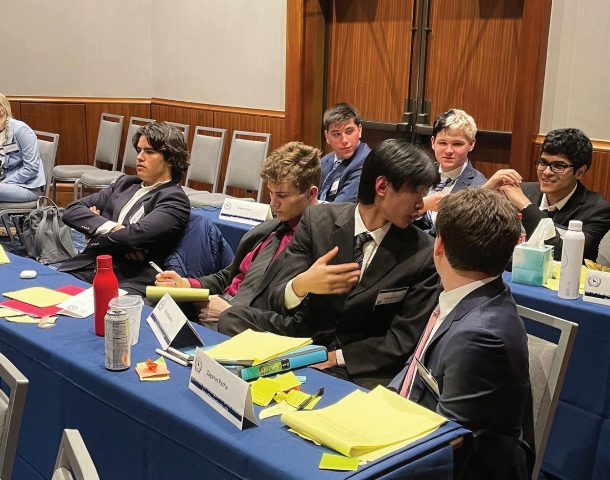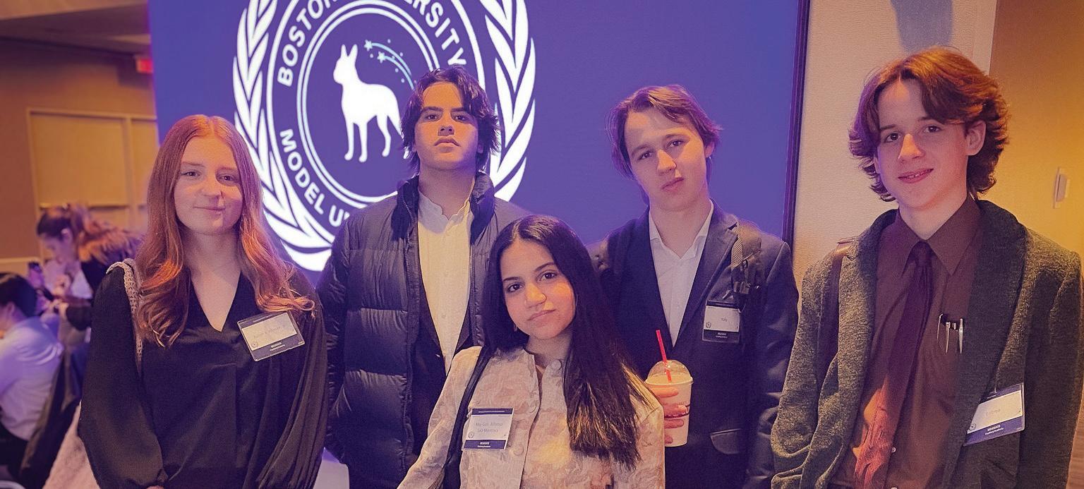 Lilia Vishnyakov '26, Daruk Seyar '26, Ikram Abounouh '26, Mateusz Jedrzejowski '28, and Peter Priestmen '29 at BOSMUN (Photo - Greg Huang-Dale)