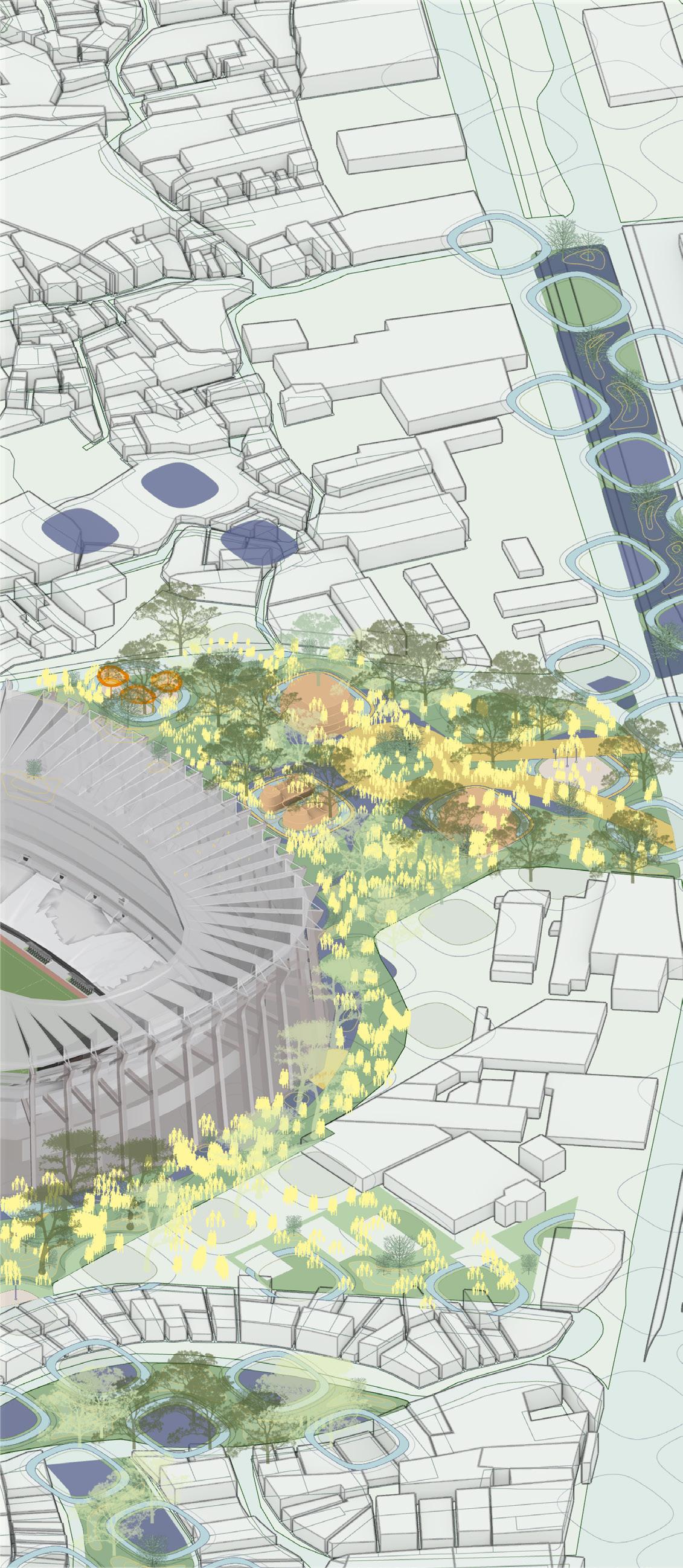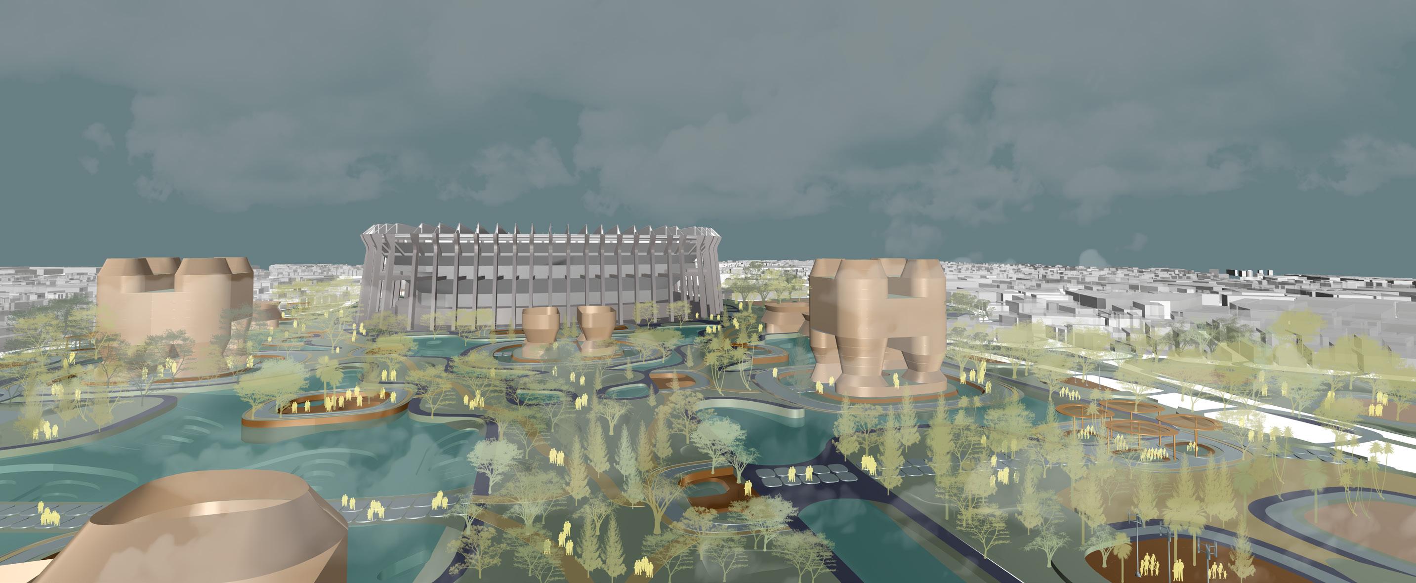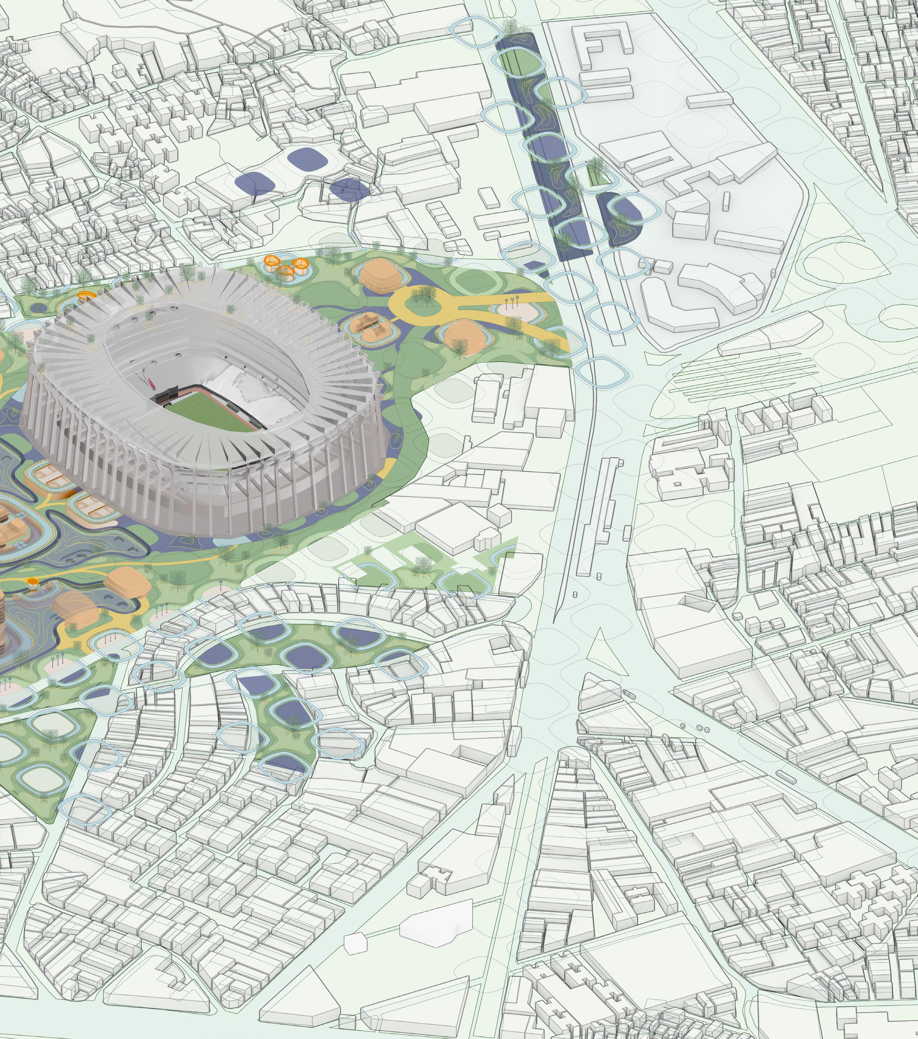 Urban Altar reimagines the stadium district as a public landscape of memory, ritual, and resilience. Anchored by Estadio Banorte, the design introduces episodic interventions, sponge parks, modular altars, and open infrastructures, that respond to both daily rhythms and natural shocks such as floods and earthquakes. Each ‘altar’ supports revenue-generating or community-oriented programs, fostering employment and a balanced urban economy.