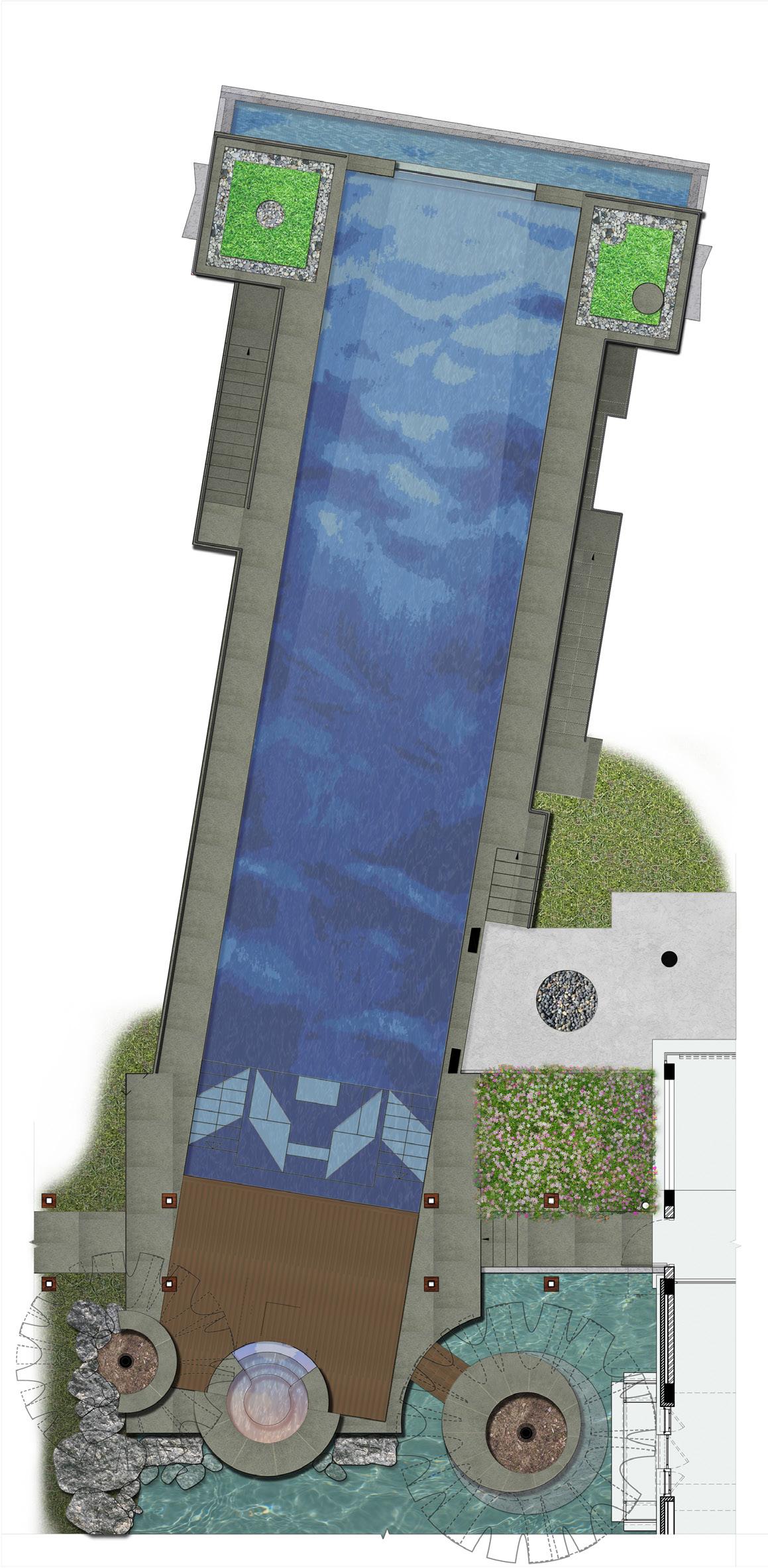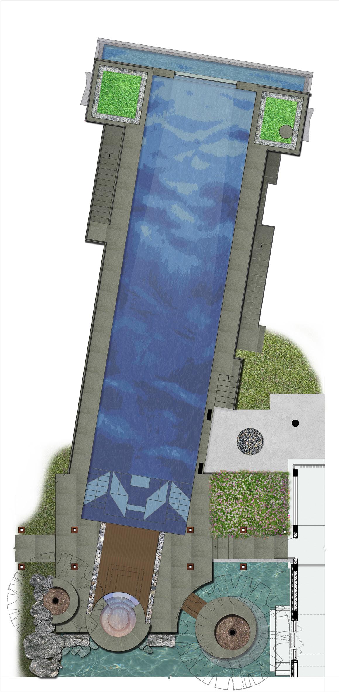 The project is organized as a series of interconnected volumes responding to the natural slope, with bridges, terraces, and a linear pool forming the primary spatial spine across the site.