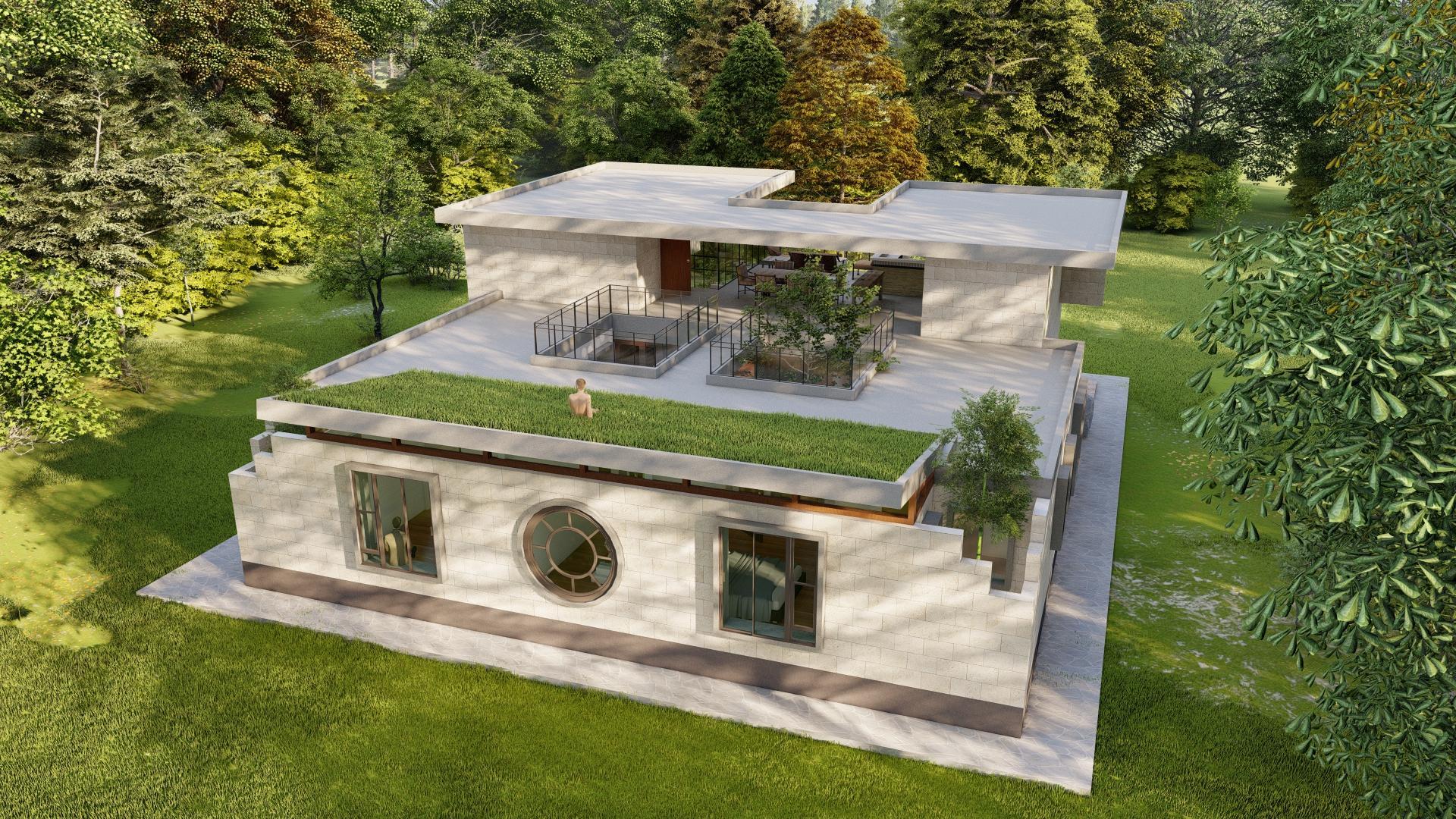 The rear perspective highlights the project’s horizontal roofscape, planted terrace surfaces, and integration of architecture with the surrounding landscape.