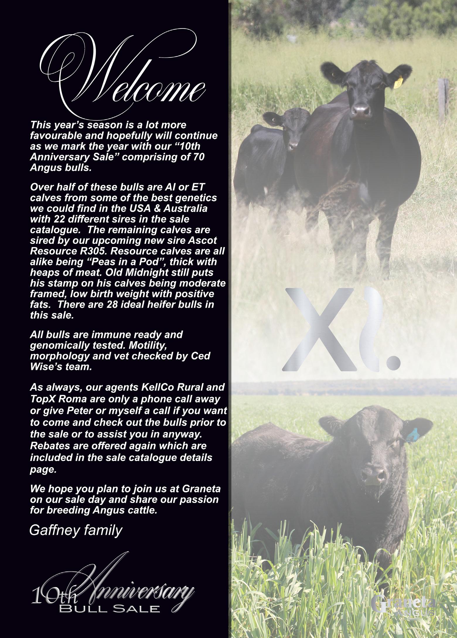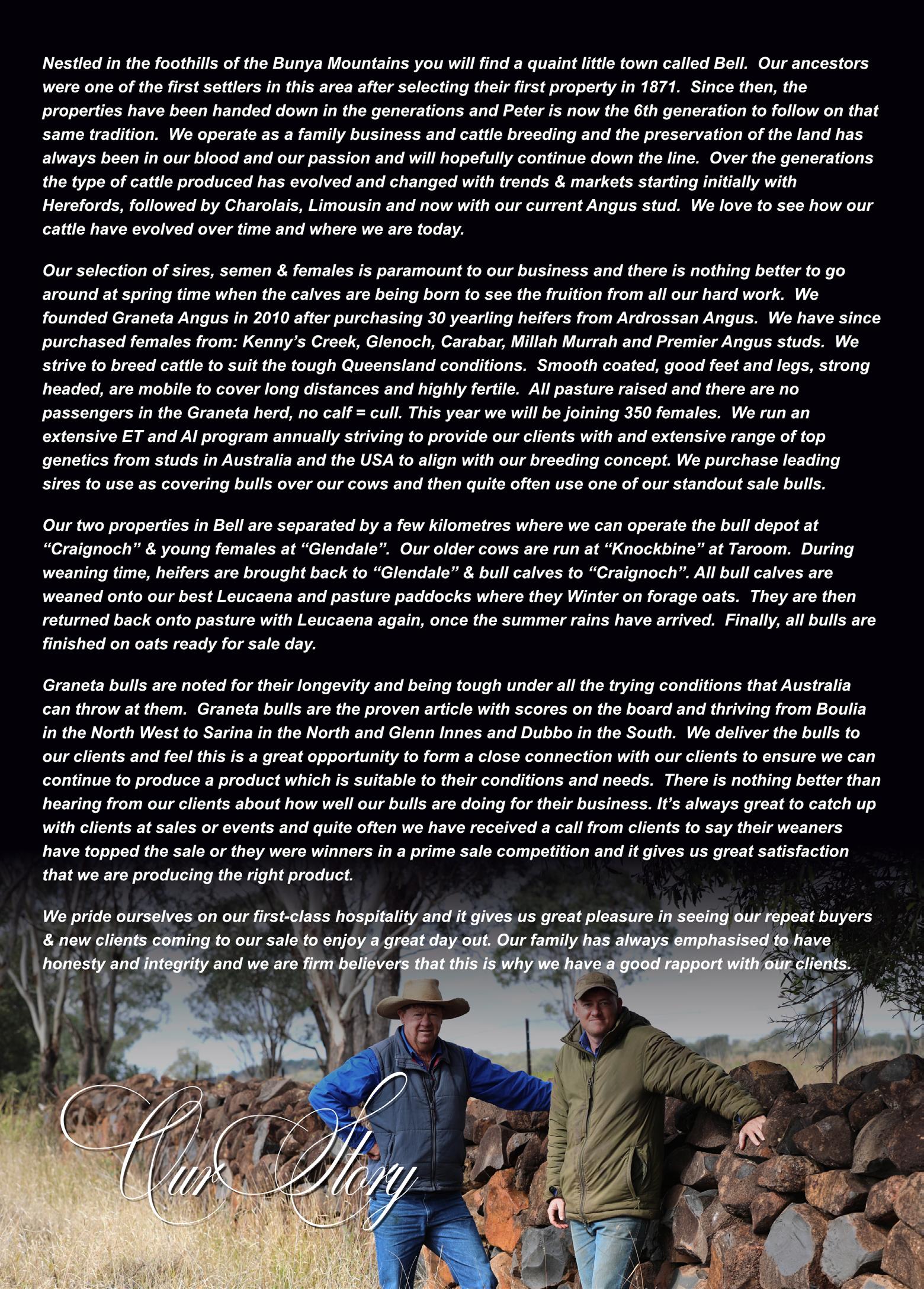 All Graneta bulls carry a freeze brand for easy ID in the paddock. Graneta sale bulls are quiet, wellmannered cattle used to being handled on foot, with dogs, ATVs, horses and vehicles. They are rigorously screened for their temperament.