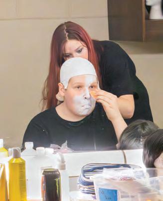 Caking his face, senior Evie Chancy uses white face paint to make senior Owen Gerrish become Uncle Fester for the Kansas Thespian Festival performance of "The Addams Family: School Edition" on Jan. 8.