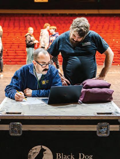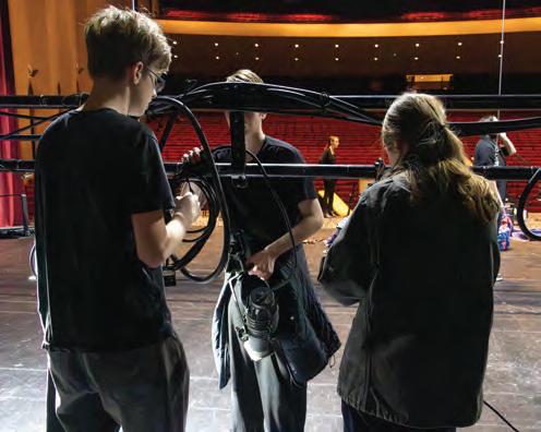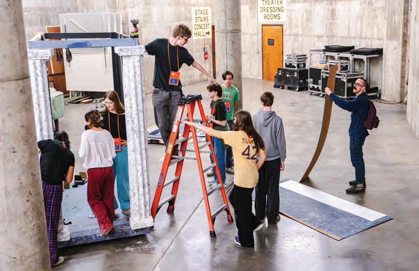 theatre teacher Bryce Jones works with a Century II theater stagehand on a fly rail layout. “To travel the show, we had to adjust a number of the show's technical elements and collaborate with professional technical personnel at Century II,” Jones said. Photo by Nathan Friedman