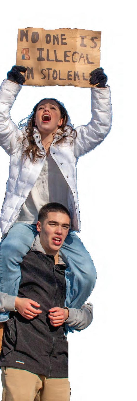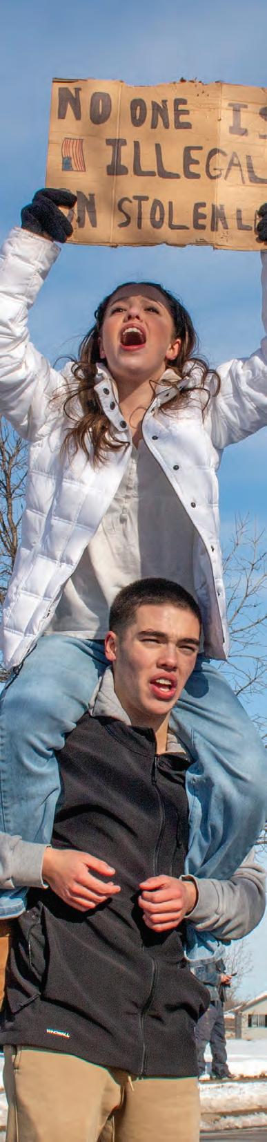 Sitting on senior Eli Stone's shoulders, senior Emi Stone holds up a sign at the ICE walkout on Jan. 27. Photo by Julia Velasco