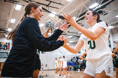 Shaking hands, junoir Roz Swimburne Romine and freshman Morgan McClorey celebrate at the Varsity Girl’s Basketball game on Dec. 2. Photo by Miles Beaty