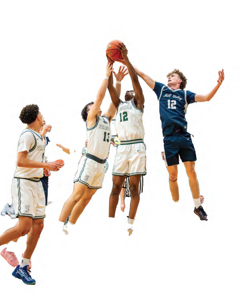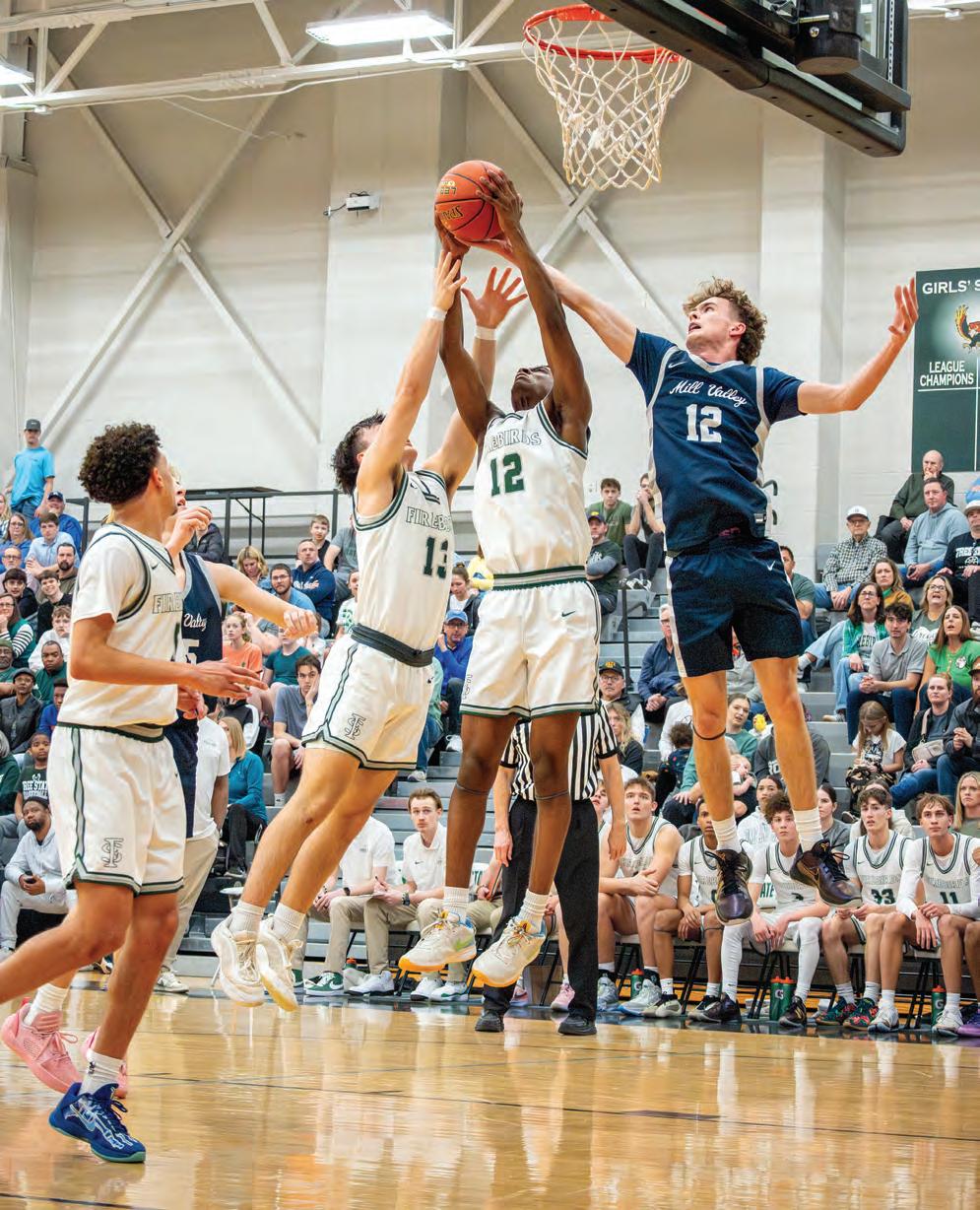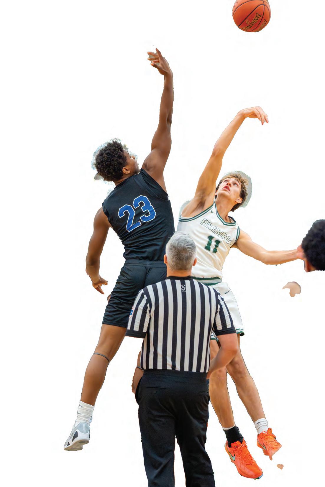 Jumping for the ball, senior Bennett Nagel plays in the varsity game against Junction City on Dec. 2. Photo by Sydney Brozik