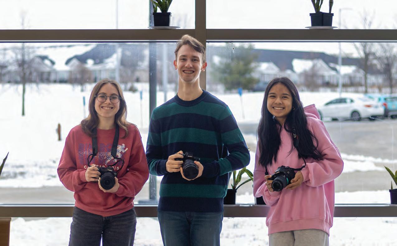 Standing together, News Photo Editors junior Ceci Bennett, senior Nathan Kramer and senior Julia Velasco pose with their cameras. Photo by Leonna Randall
