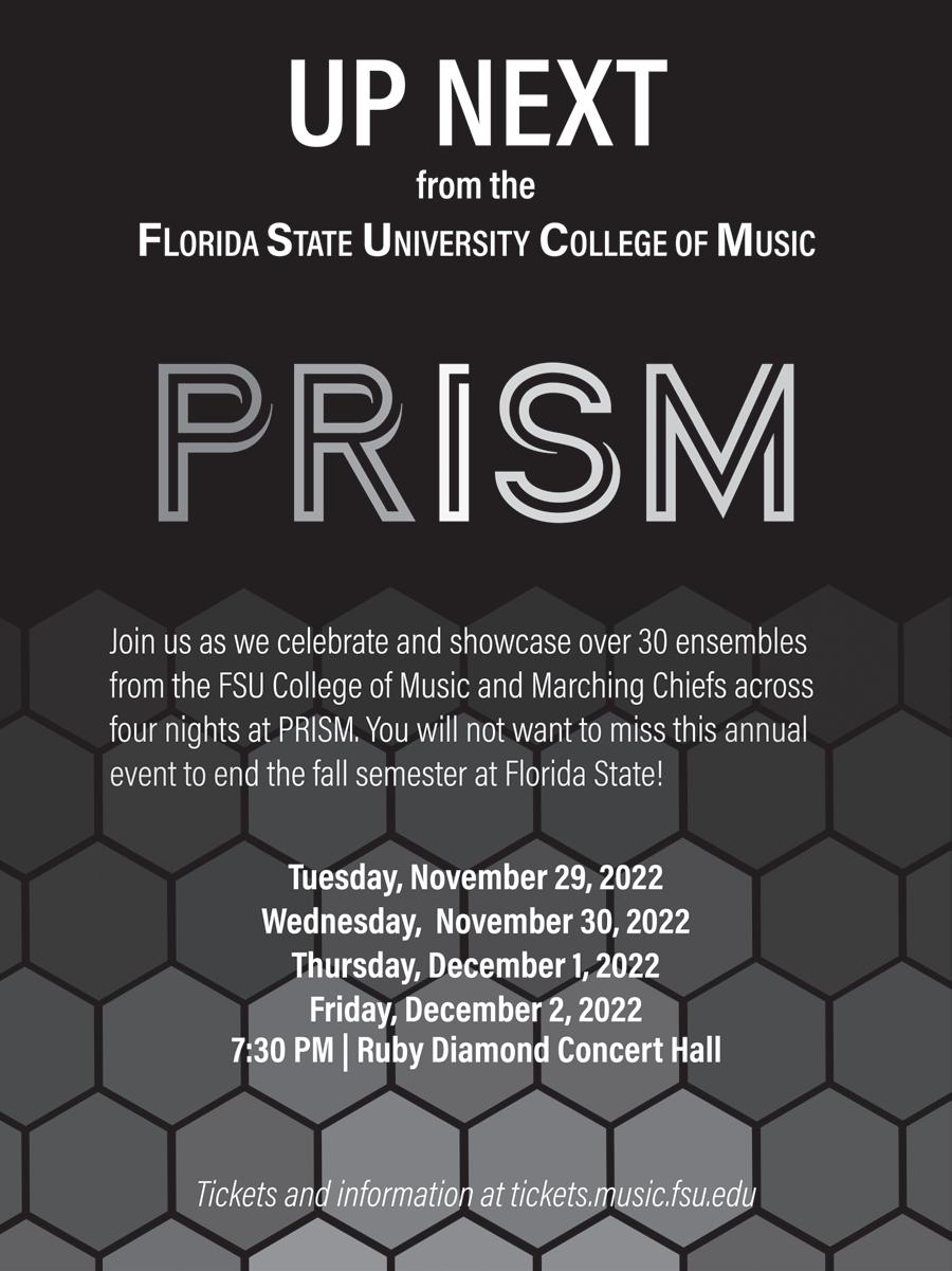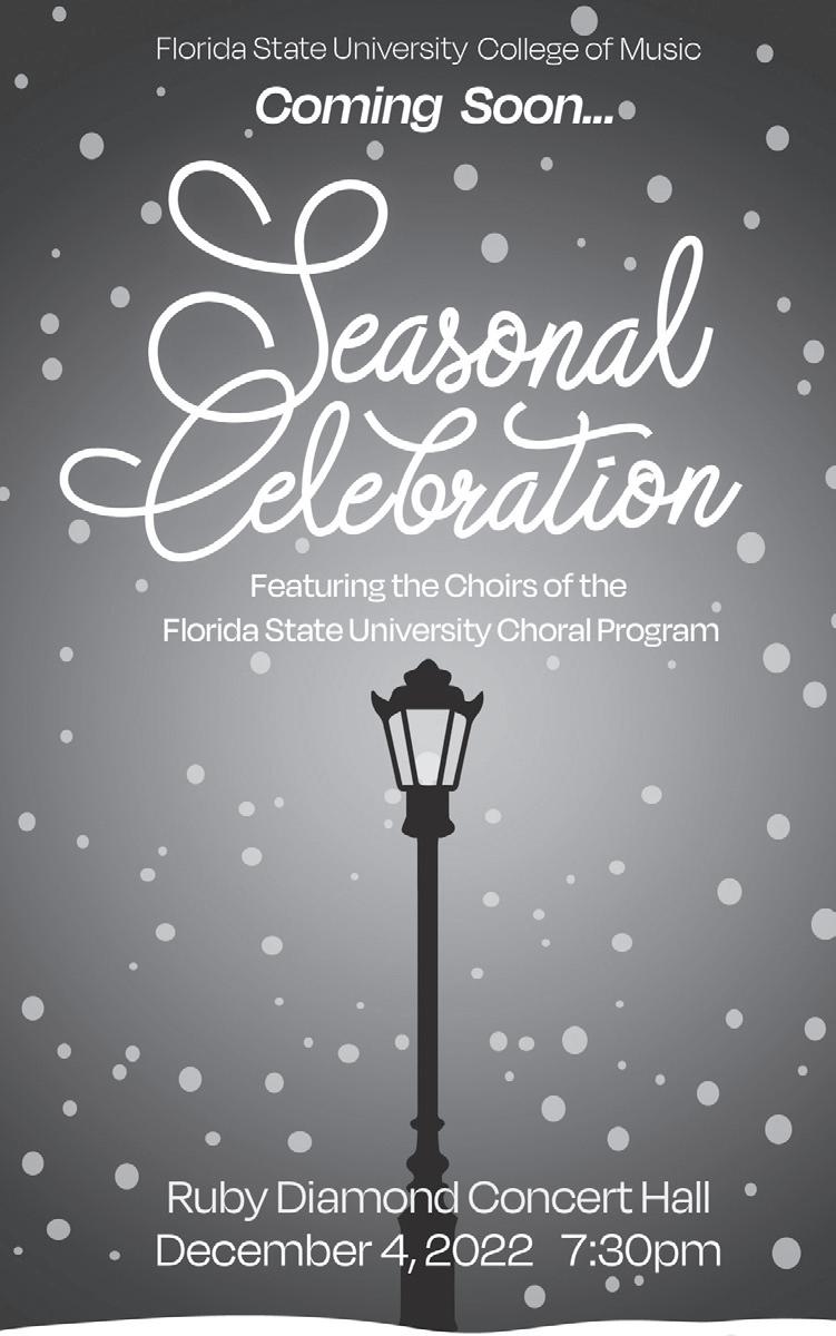 Please refrain from talking, entering, or exiting while performers are playing. Food and drink are prohibited in all concert halls. Please turn off cell phones and all other electronic devices. Please refrain from putting feet on seats and seat backs. Children who become disruptive should be taken out of the performance hall so they do not disturb the musicians and other audience members. Health Reminder: The Florida Board of Governors and Florida State University expect masks to be worn by all individuals in all FSU facilities. Thank you for your cooperation.