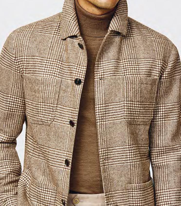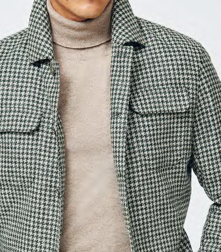 Rich jade and taupe hues in houndstooth and twill capture an easygoing charm and an effortlessly cool vibe.