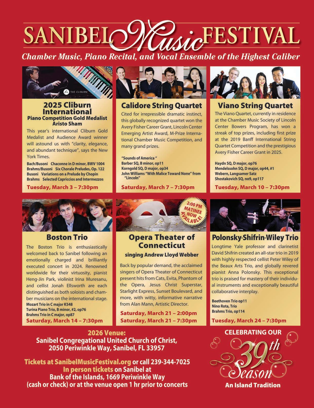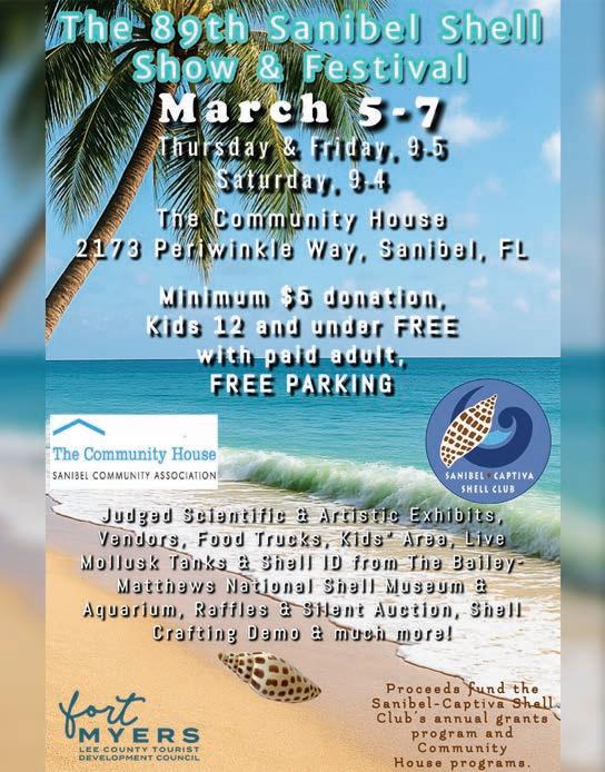 he Sanibel Shell Show & Festival will be held March 5-7. The event will feature shells from around the world displayed in artistic and scientific exhibits, as well as works of art using shells, and world-class shell vendors.