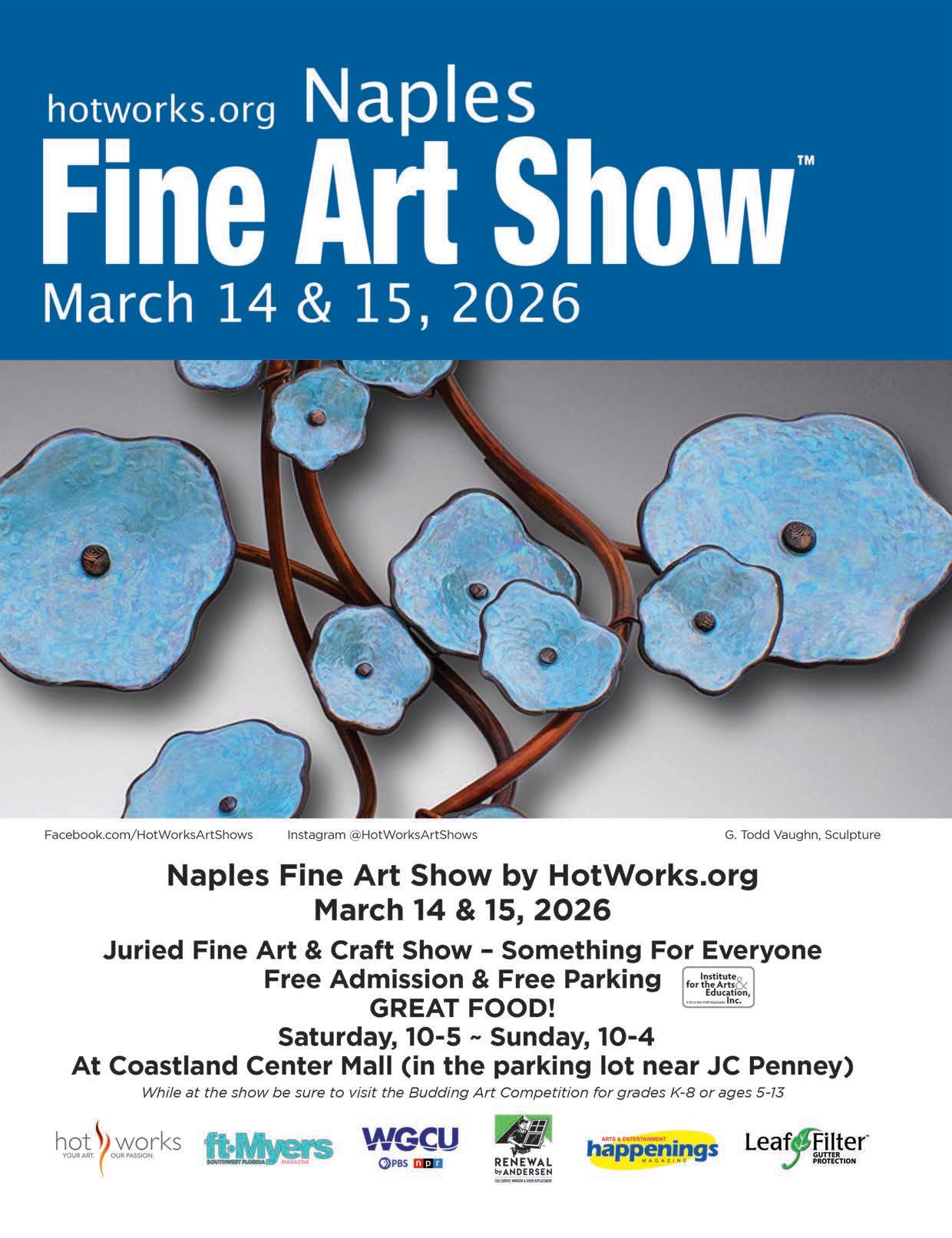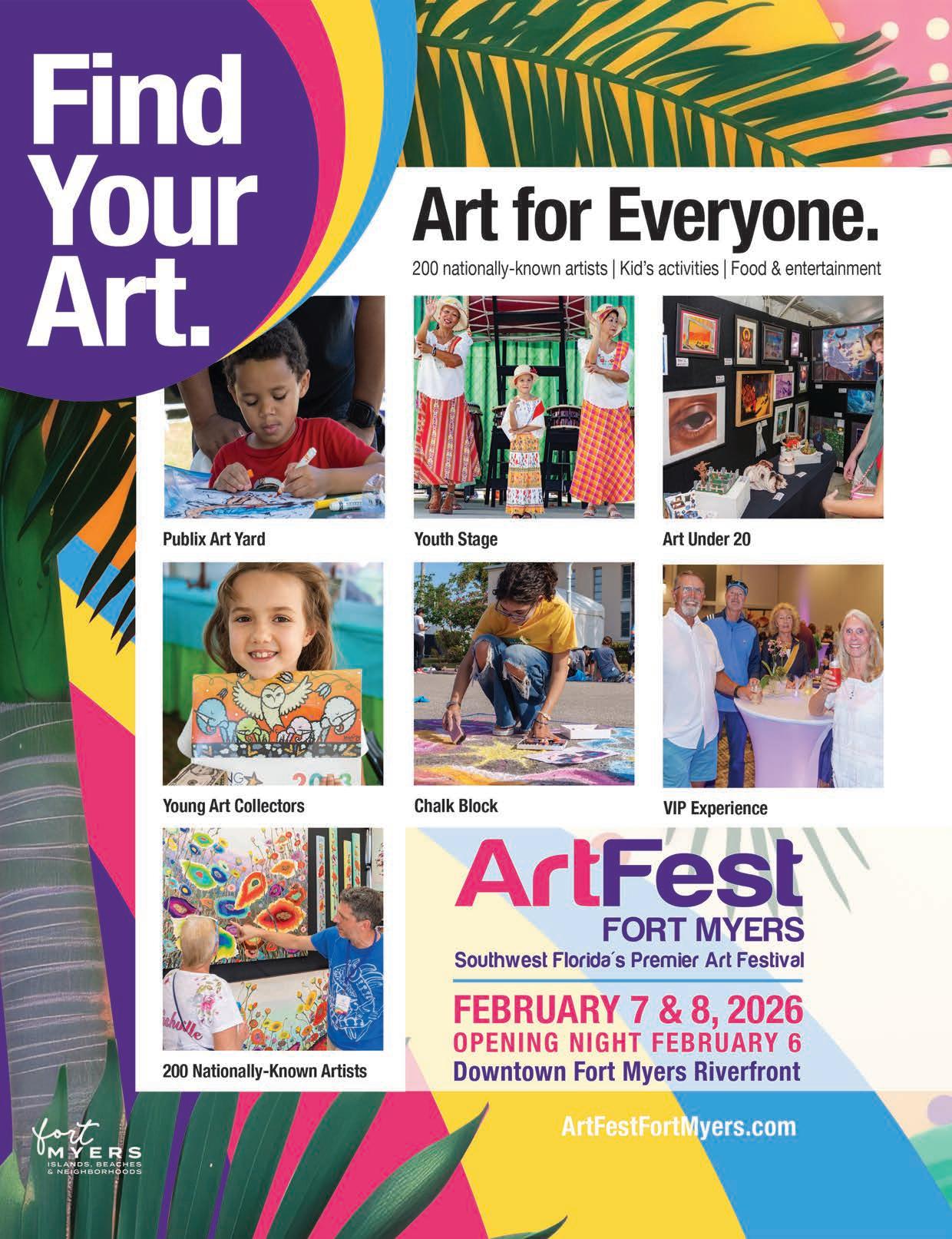 rtFest Fort Myers, February 6-8, features more 200 artists from around the country and worldwide, showcasing paintings, sculptures, glasswork, and ceramics. Artworks are originals and limited reproductions. The festival also features live music, a variety of vendors, and family-friendly entertainment and activities. ArtFest is free and open Saturday, February 7, 10am-5pm & Sunday, February 8, 10am-4pm. There is a opening night party is Friday, February 6, 6-9pm.